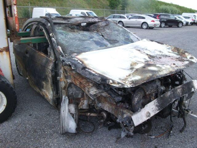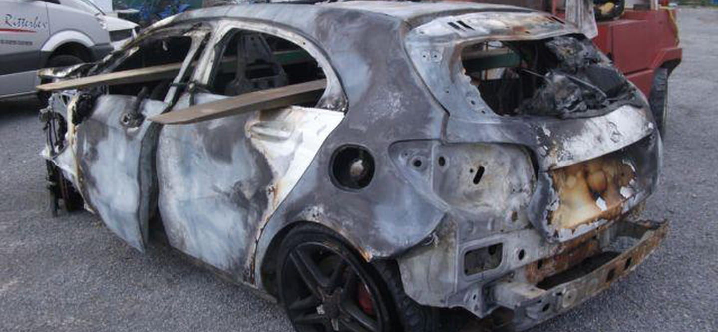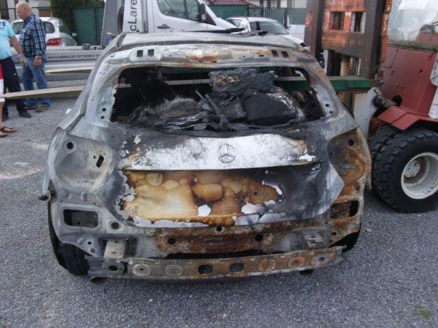 Pero los daños de esta unidad no pasan sólo por los frutos del incendio. Previamente, antes de echar a arder, este A 45 AMG tuvo un golpe… y no precisamente pequeño a juzgar por los daños en la carrocería del pequeño de AMG.