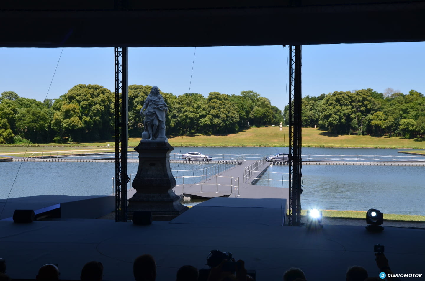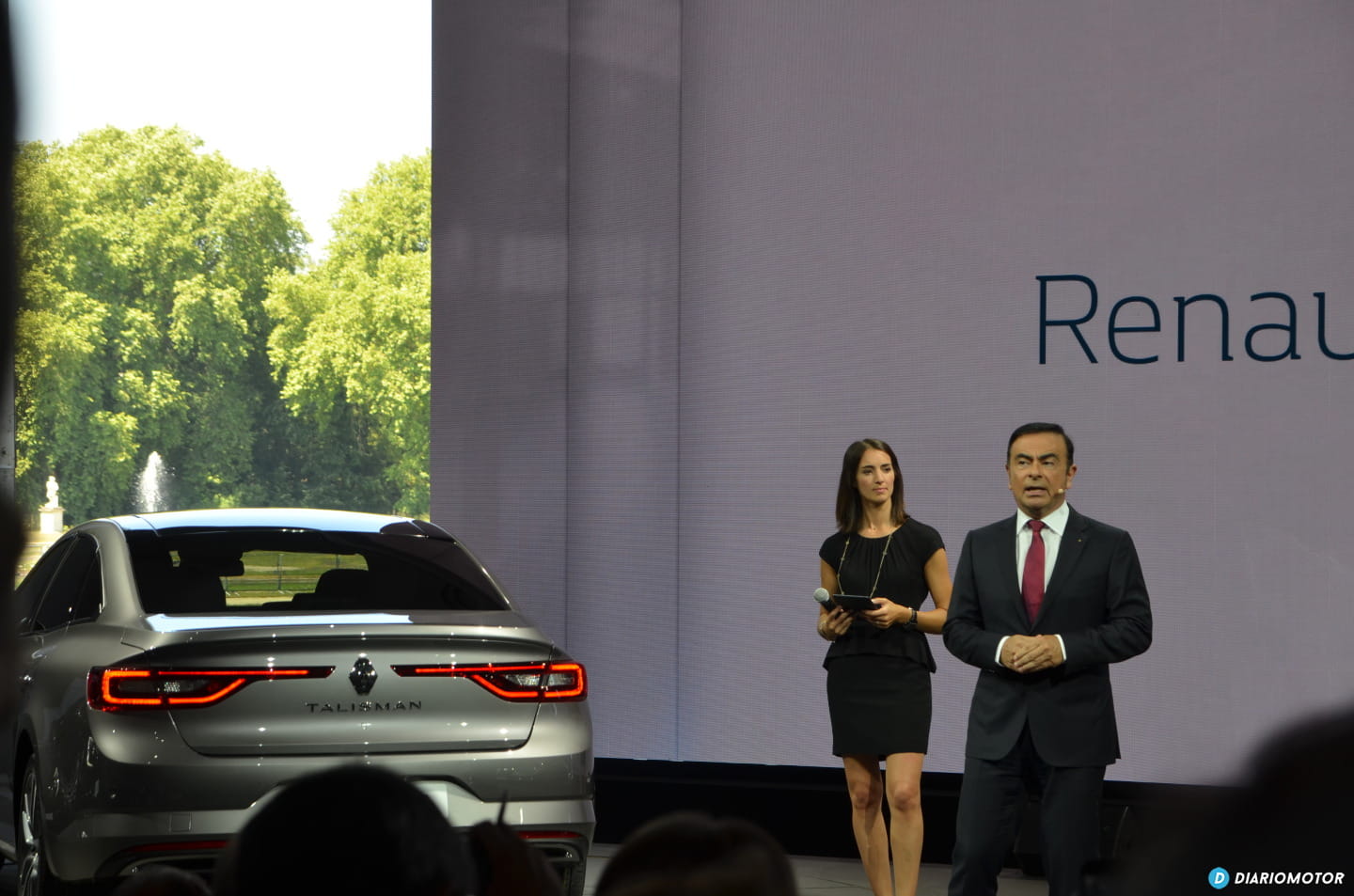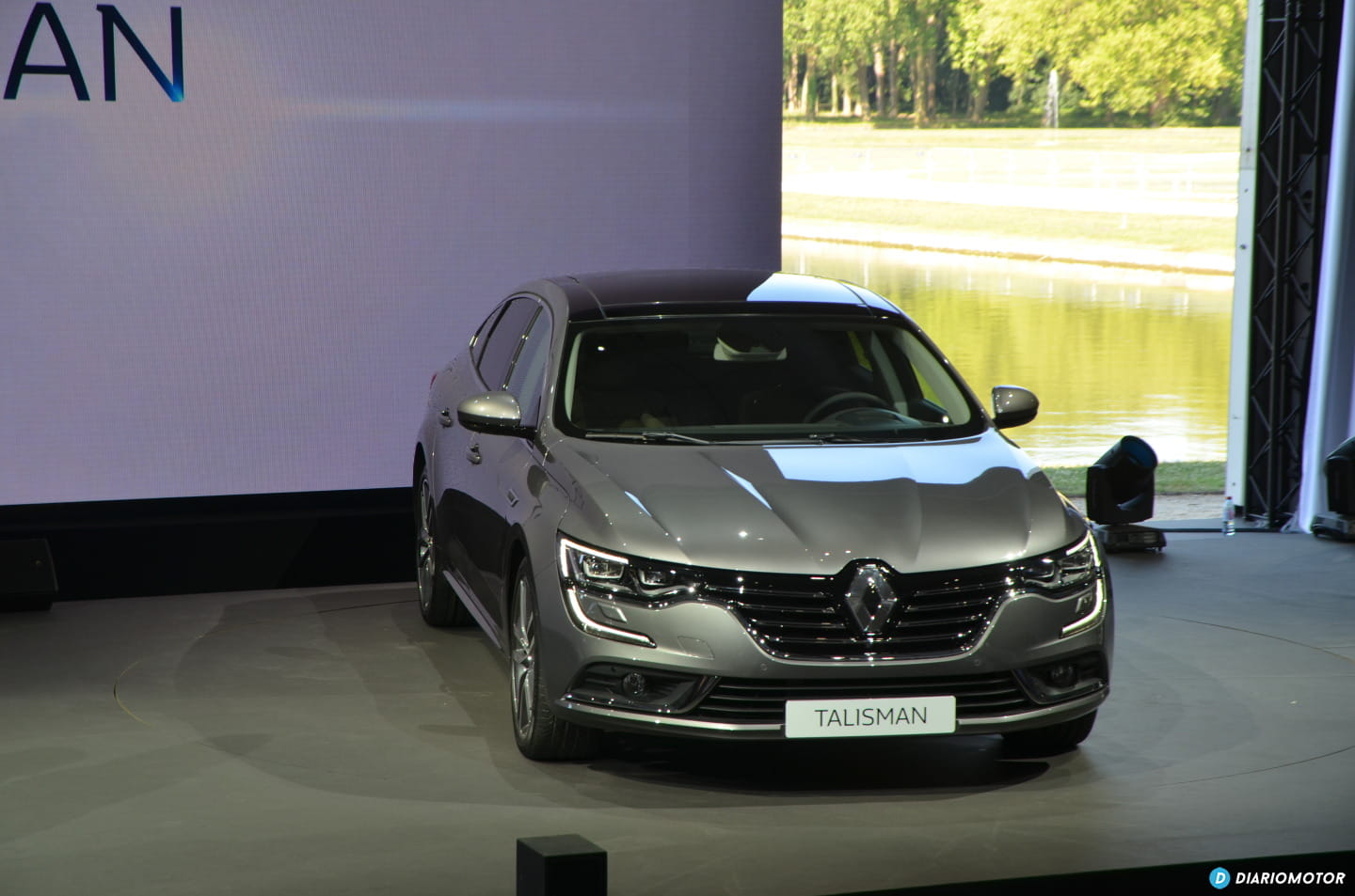 Tras una breve introducción las puertas situadas a la espalda de Ghosn comienzan a moverse dejando al descubierto uno de los lagos de los jardines del palacio. A lo lejos empieza a tomar forma la silueta del nuevo Renault Talisman.