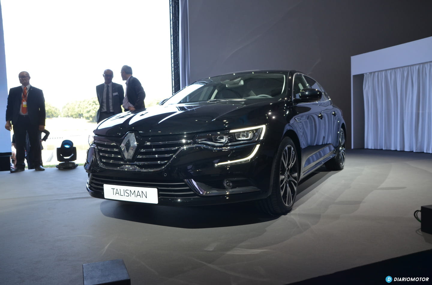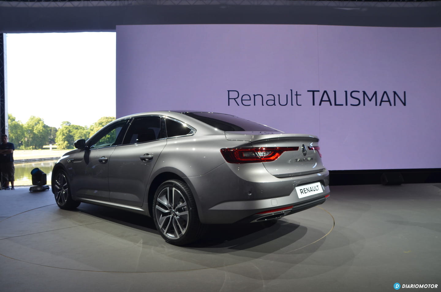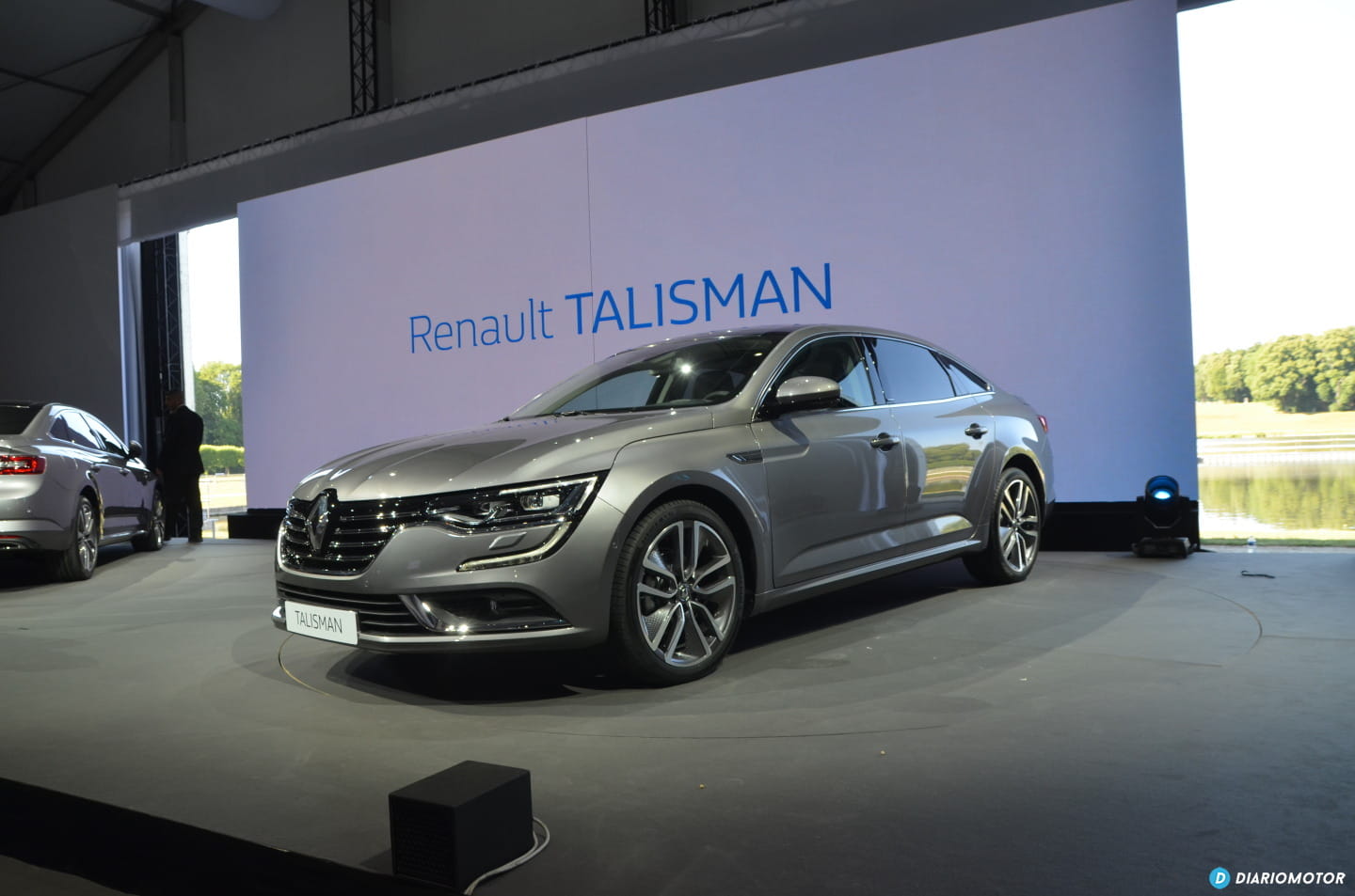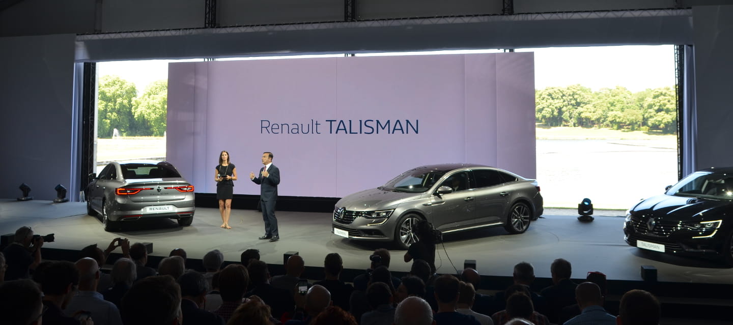 Dos unidades llegan cruzando una pasarela situada sobre el lago, otras dos unidades aparecen en escena también sobre el escenario. Ante nosotros el nuevo Renault Talisman, ante nosotros la nueva berlina de Renault.