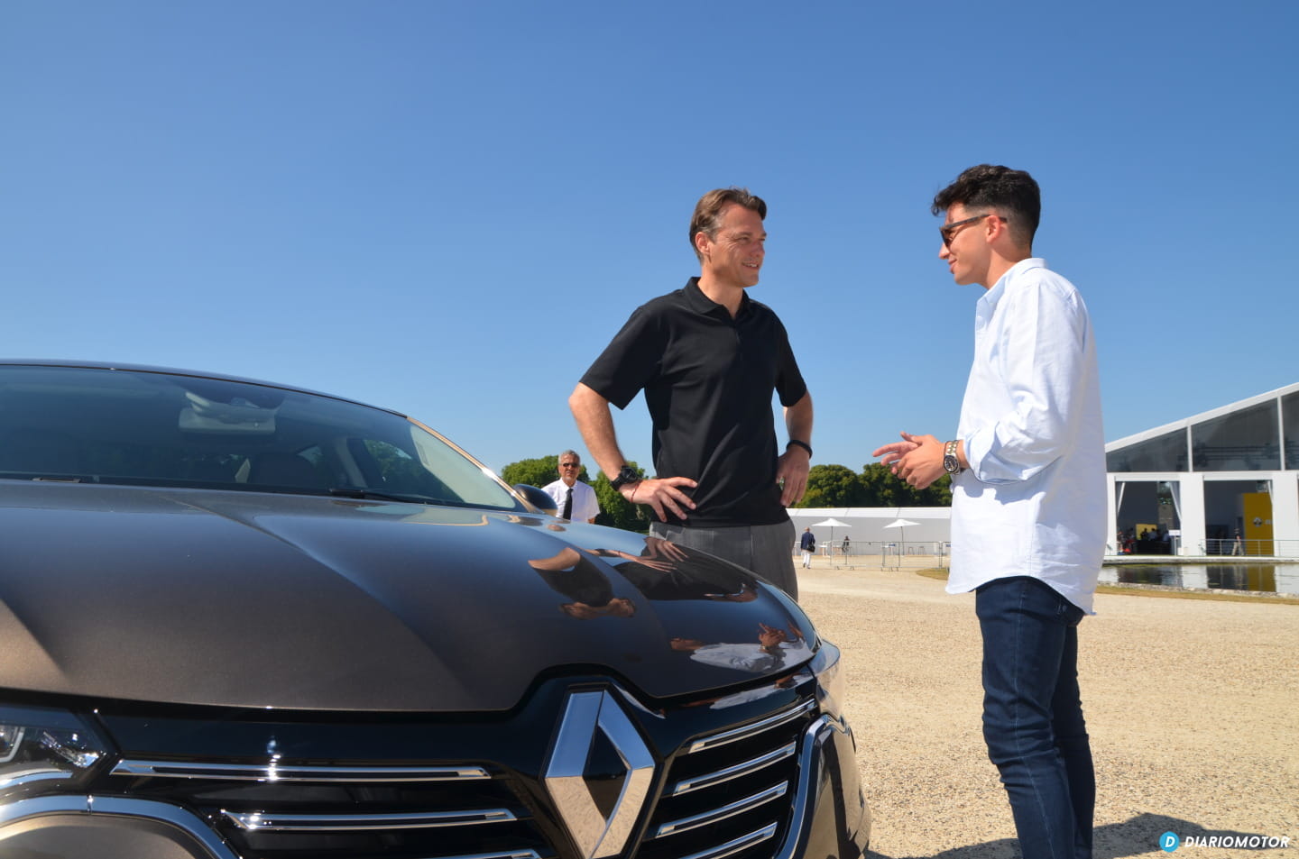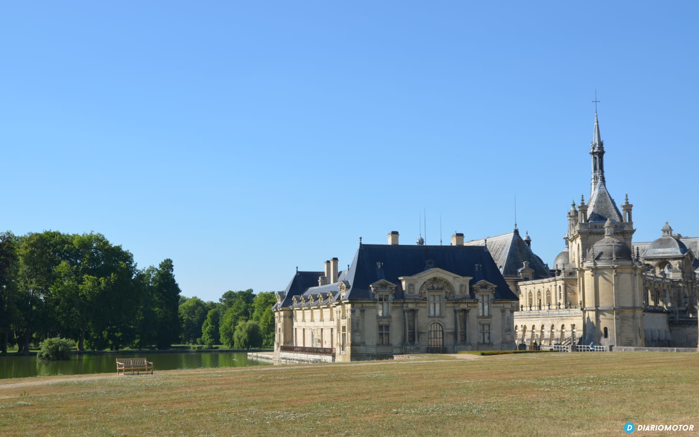 Ese sol abrasador que creía dejar atrás en Madrid nos acompaña, no hay forma de darle esquinazo. Renault ha escogido este palacio, este Château de Chantilly, del siglo XVI, para presentarnos a su nueva berlina. No, la gala no se va a llevar a cabo en uno de sus salones, sino que nos trasladan hasta uno de sus jardines. Un breve almuerzo y ahí estamos, sentados en unas gradas esperando a que Renault desvele a su nueva berlina.