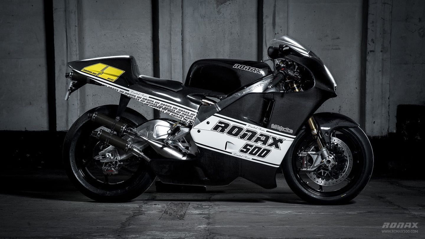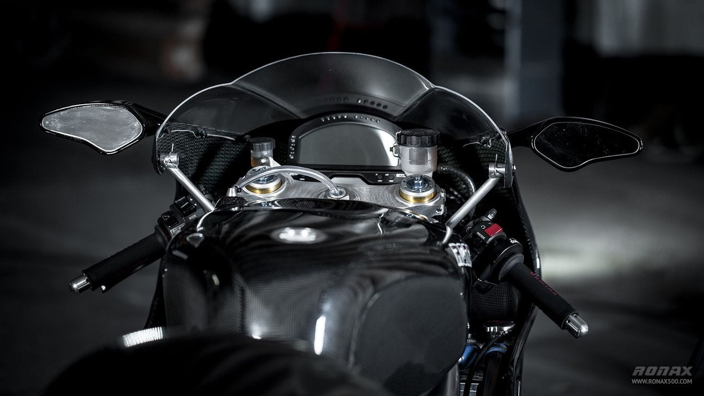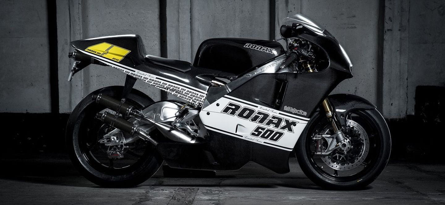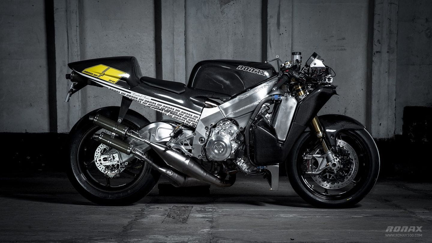 La construcción de la Ronax 500 es idéntica a la de las Moto GP de antaño. Un chasis de aluminio soldado a mano es el corazón de la moto, con un impresionante motor V4 actuando de elemento autoportante. El motor de cuatro cilindros en V emplea inyección de combustible y electrónica moderna, pero su funcionamiento es de dos tiempos. Es un motor explosivo, agudo, enfadadísimo. Desarrolla a partir de sólo medio litro de cilindrada la tremenda potencia de 160 CV a 11.500 rpm. Hablamos de 320 CV/litro de potencia específica.
