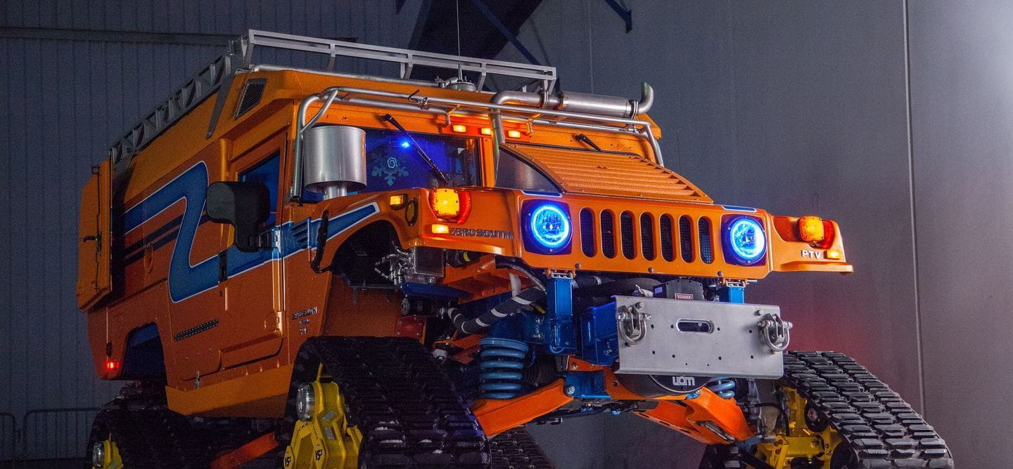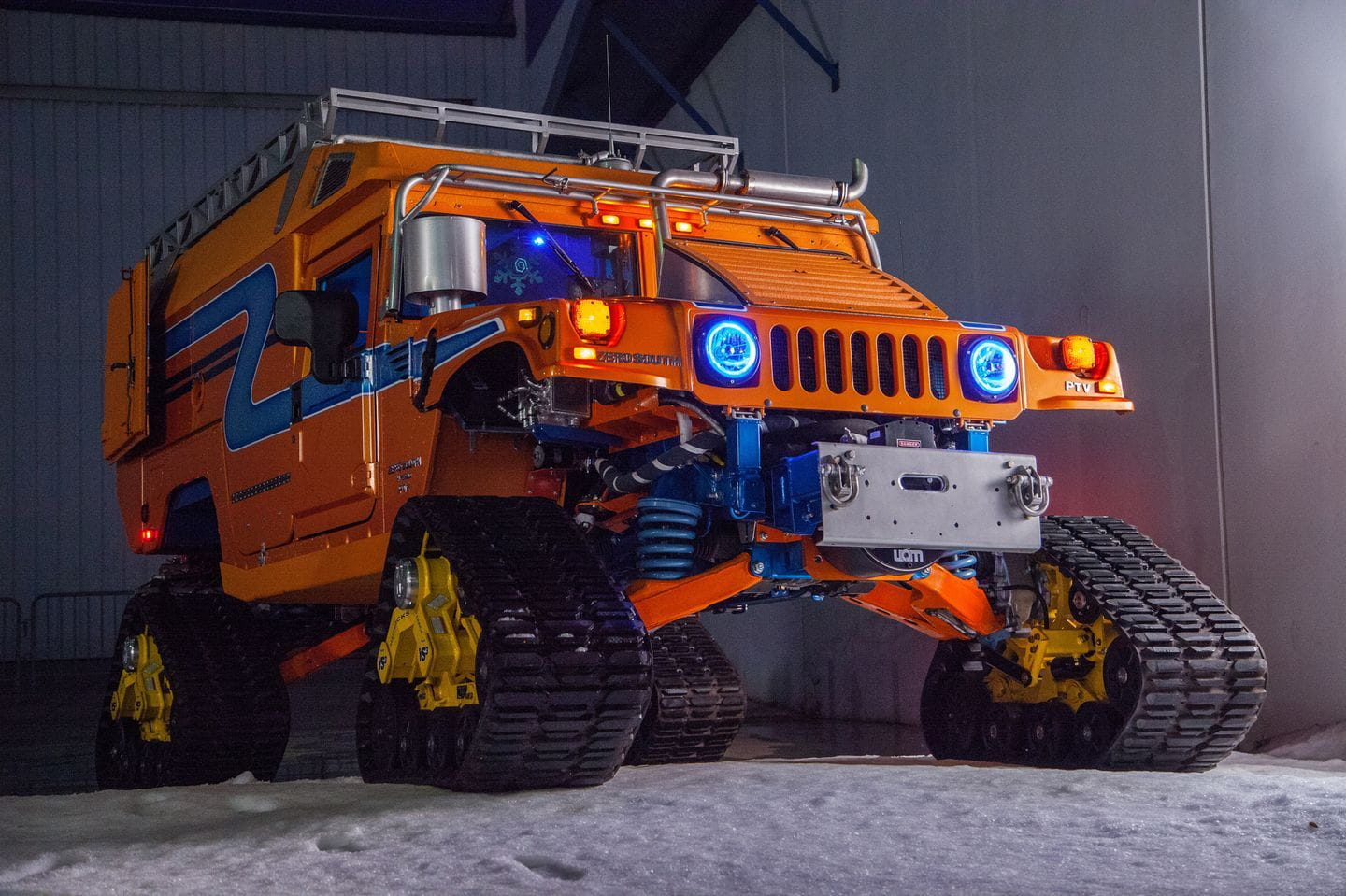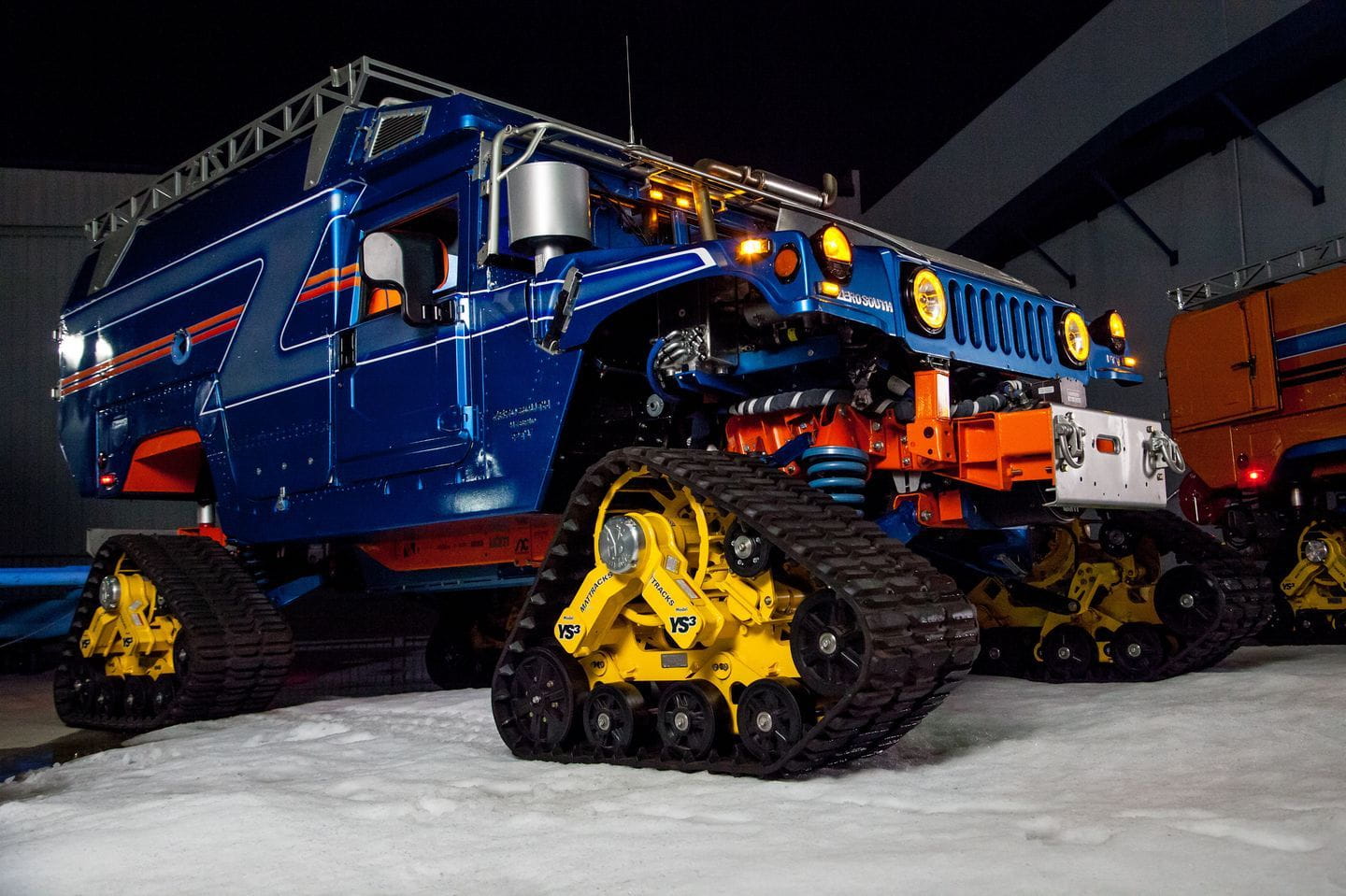 Es aquí donde entran los dos vehículos, bautizados como Hybrid Polar Traverse Vehicles (PTV, 1 y 2). Los dos vehículos ya están construidos y apenas se parecen en nada a los Hummer H1 de los que partían. Digamos que sólo el chasis es igual. Baggarly escogió el Hummer H1 por ser uno de los pocos todoterrenos más anchos que altos, una cualidad imprescindible en el hielo de la Antártida. Una de las primeras modificaciones fue reemplazar sus neumáticos por cadenas de goma, como si de un tanque se trataran.