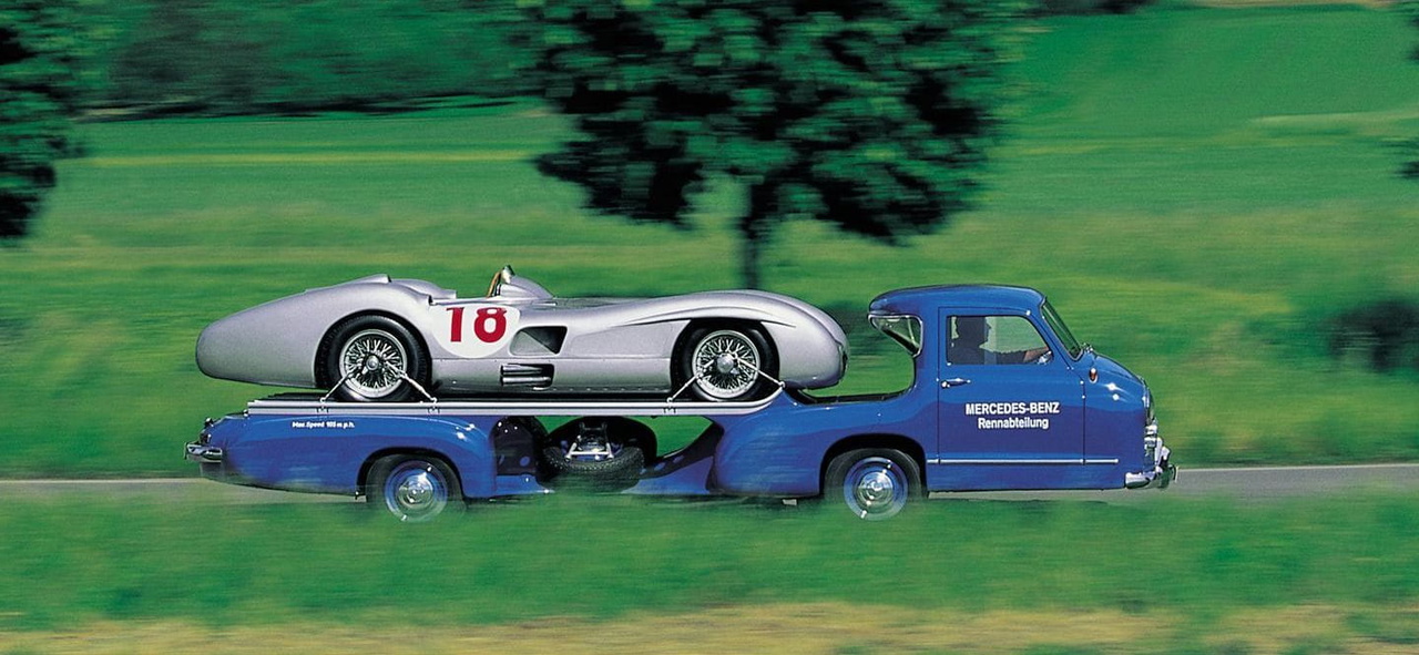 Es una de las historias de las que nunca me canso. Corrían los años 50 y Mercedes necesitaba un transporte para sus flechas de plata. Hablamos de los impresionantes W196, flechas de plata como el 300 SLR donde el gran Fangio y Stirling Moss dominaban la Fórmula 1 de la época. No valía un camión de transporte cualquiera. Necesitaban una máquina rápida que pudiera salvar a Mercedes si hubiera que hacer un viaje a la fábrica. Además, debía ser un transporte a la altura del mejor coche del momento. Con ustedes, el Mercedes Renntransporter.