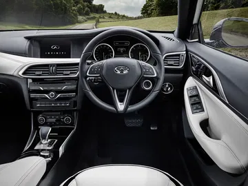Esta pantalla no es de control táctil y curiosamente, no sigue los cánones de diseño actuales del diseño: ni es plegable ni parece flotar sobre el salpicadero. En este sentido, gracias Infiniti – sigo sin aceptar la moda de las pantallas flotantes, lo siento. El Q30 tendrá tres acabados interiores: el City Black combina tapicería negra con paspuntado púrpura, el Cafe Teak es clásico – ribeteado negro sobre tapicería marrón; y Gallery White combina cuero blanco con toques rojos, un aspecto más pasional.