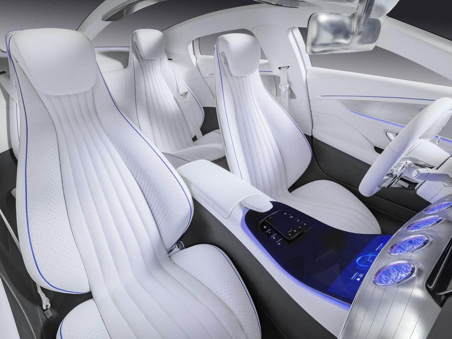 En su interior se nos da una aproximación en clave conceptual al futuro del coche premium. Todo es táctil, apenas hay botones y el diseño es aún más minimalista que el de los actuales modelos de Mercedes. Los asientos o las salidas de ventilación son puramente fantasía, pero los controles táctiles del volante o el módulo de control central podrían pronto encontrarse en coches de producción. No obstante, lo más interesante de este prototipo es su exterior, su aerodinámica activa. Es realmente sorprendente.