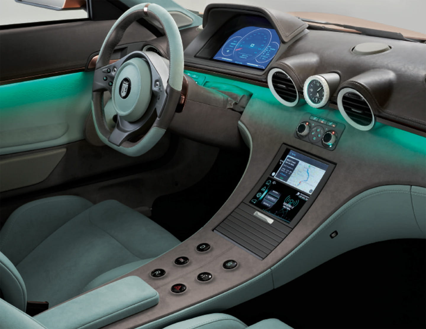 El habitáculo, a mi juicio, es uno de los puntos más flojos de este deportivo. Artega ha buscado un diseño lujoso, con una combinación atípica de colores, y un halo tecnológico, con un cuadro de mandos completamente digital y una consola central dominada por una buena pantalla. Y a mi juicio lo que han conseguido es que su interior parezca el de aquellos prototipos que hace 30 años se imaginaban cómo sería el futuro en el Siglo XXI. Y obviamente no acertaban.