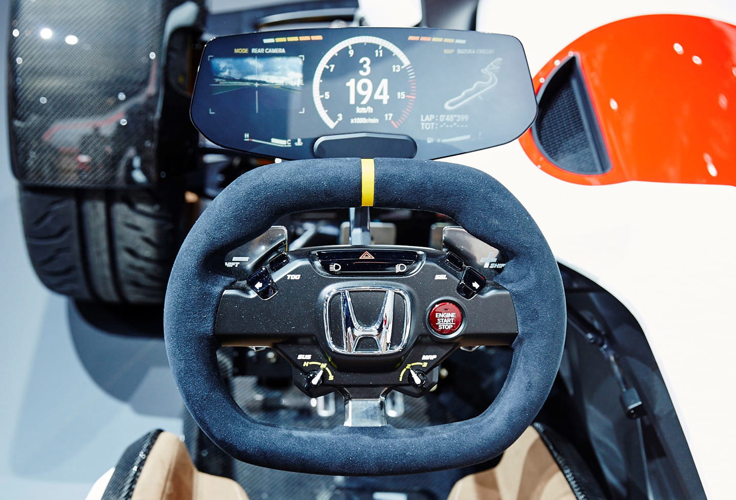 6. Un «cockpit» futurista. Sin desmerecer la sencillez exterior, el Honda Project 2&4 cuenta con un espectacular cuadro de mandos digital, a modo de tablet colocado sobre el salpicadero. Un cuadro de mandos que, además de mostrar la velocidad, o el régimen de revoluciones, puede darnos información relevante acerca del trazado del circuito, nuestros mejores tiempos, e incluso hacer las veces de espejo retrovisor mediante una cámara integrada en la zaga. Recuerda que en su carrocería no hay sitio para espejos retrovisores.