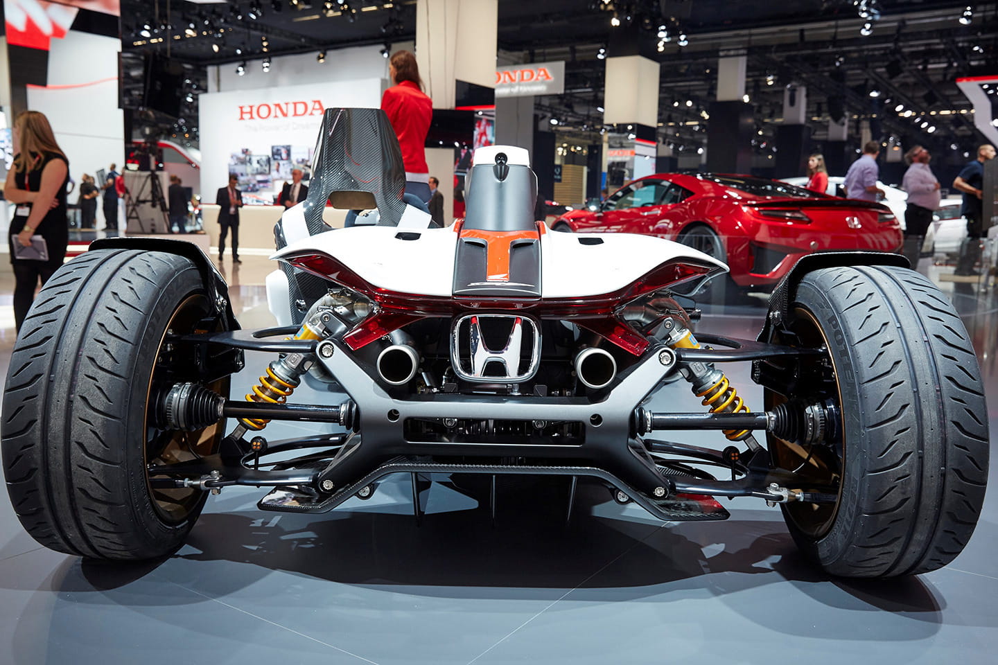 3. Una carrocería extremadamente simple y un chasis pensado para los circuitos. De llegar a materializarse en un producto final, el Honda Project 2&4 estaría limitado, muy probablemente, a un uso en circuito. Eliminando las necesidades de la conducción en carreteras públicas, te puedes permitir lujos como evitar pasos de rueda y hacer que los ejes sobresalgan por fuera de la carrocería.