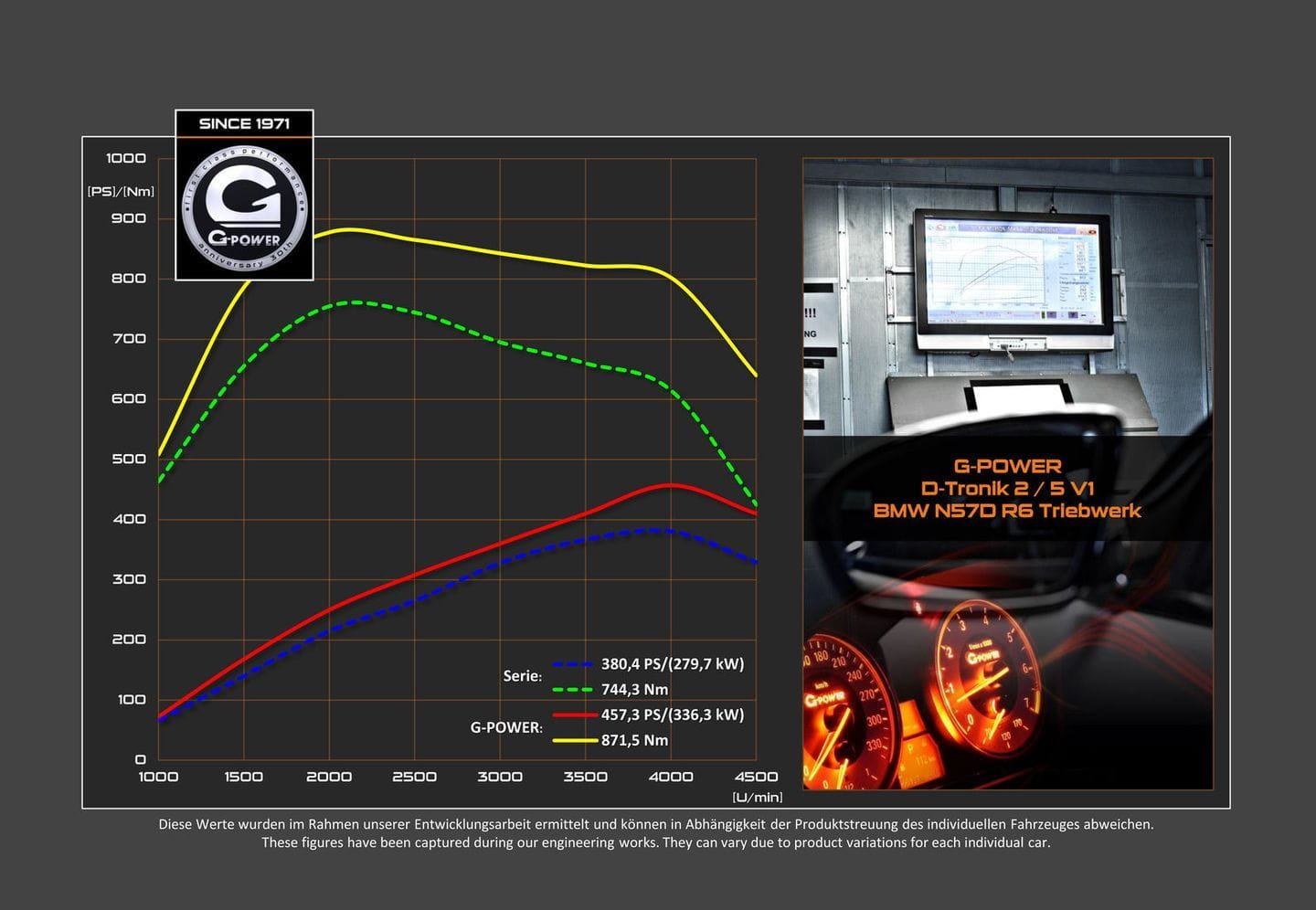 De serie, el BMW X6 M50d ya es una máquina de lo más respetable. Su motor 3.0 turbodiésel tiene 381 CV de potencia y 740 Nm de par motor, permitiendo un 0 a 100 km/h de sólo 5,2 segundos, junto a una punta autolimitada a 250 km/h. Como muchos preparadores, la solución de G-Power es electrónica. En primer lugar, ofrecen un chip llamado G-Power D-Tronik 5 V1. En lugar de reemplazar a la ECU original, se sitúa entre la misma y el propulsor. Y sólo entra en funcionamiento ante una fuerte presión del acelerador del coche.