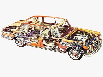 El peso en vacío de la versión de batalla corta era ya de 2.600 kilos, con una longitud de nada menos que 5,45 metros. Su motor empleaba ya inyección mecánica. Denominado M100, es un V8 de 6,3 litros, que en su momento desarrollaba 250 CV de potencia, que pasaban al tren trasero a través de un cambio automático de cuatro relaciones. Si se mantenía adecuadamente, era un coche extraordinariamente fiable, capaz de aportar a sus pasajeros un confort que nada tenía que envidiar al de un Rolls-Royce.