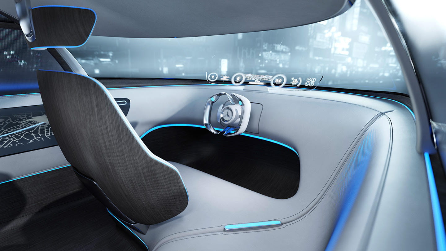 Mercedes-Benz quiere que el interior de sus coches autónomos se parezca a lo que ves más arriba. Una inmensa sala de estar dotada de sistemas de entretenimiento muy avanzados, que aprovechan cada superficie – incluso las lunas acristaladas – para situar una pantalla.