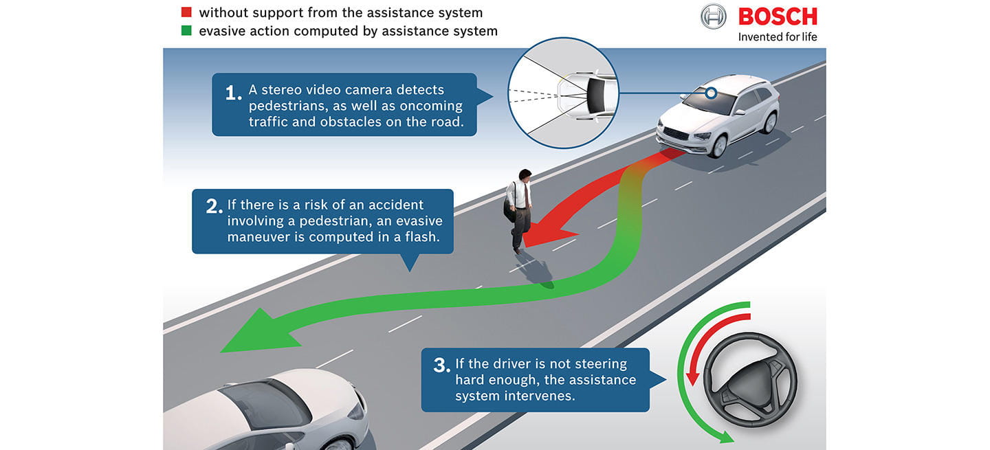 Según los ingenieros de Bosch (vía The Engineer) lo más complicado del proyecto ha sido calibrar el sistema de reconocimiento de imágenes que ha de detectar a los peatones, cuyos movimientos a menudo son erráticos. Por ejemplo, imaginemos un niño detrás de un balón, que sale corriendo, se detiene, y en el peor de los casos vuelve a correr. Para que el sistema asista el giro del volante, no solo ha de haber detectado correctamente a un peatón en nuestra trayectoria, sino también haber determinado que en la dirección en la que se practicará la esquiva no hay obstáculos, como peatones, u otros coches.
