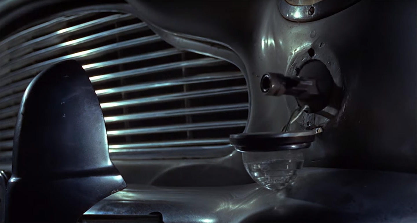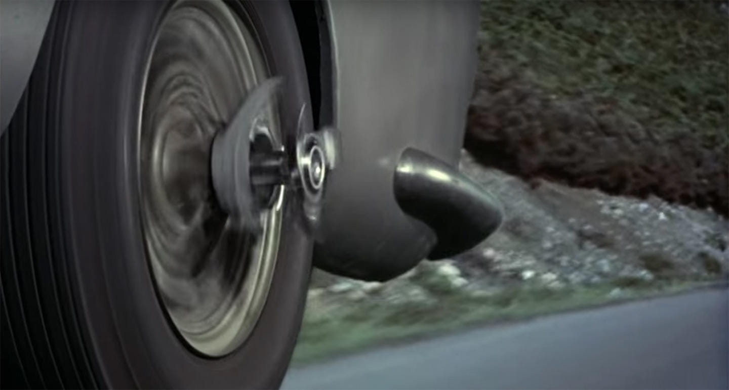 3. Eje con máquina fresadora en las llantas. El Aston Martin DB5 original estaba equipado con un arsenal de armas y técnicas para evadir persecuciones. Una de las más peculiares, sin duda esta cabeza fresadora solidaria al eje para destrozar a cualquier coche que osase emparejarse con él
