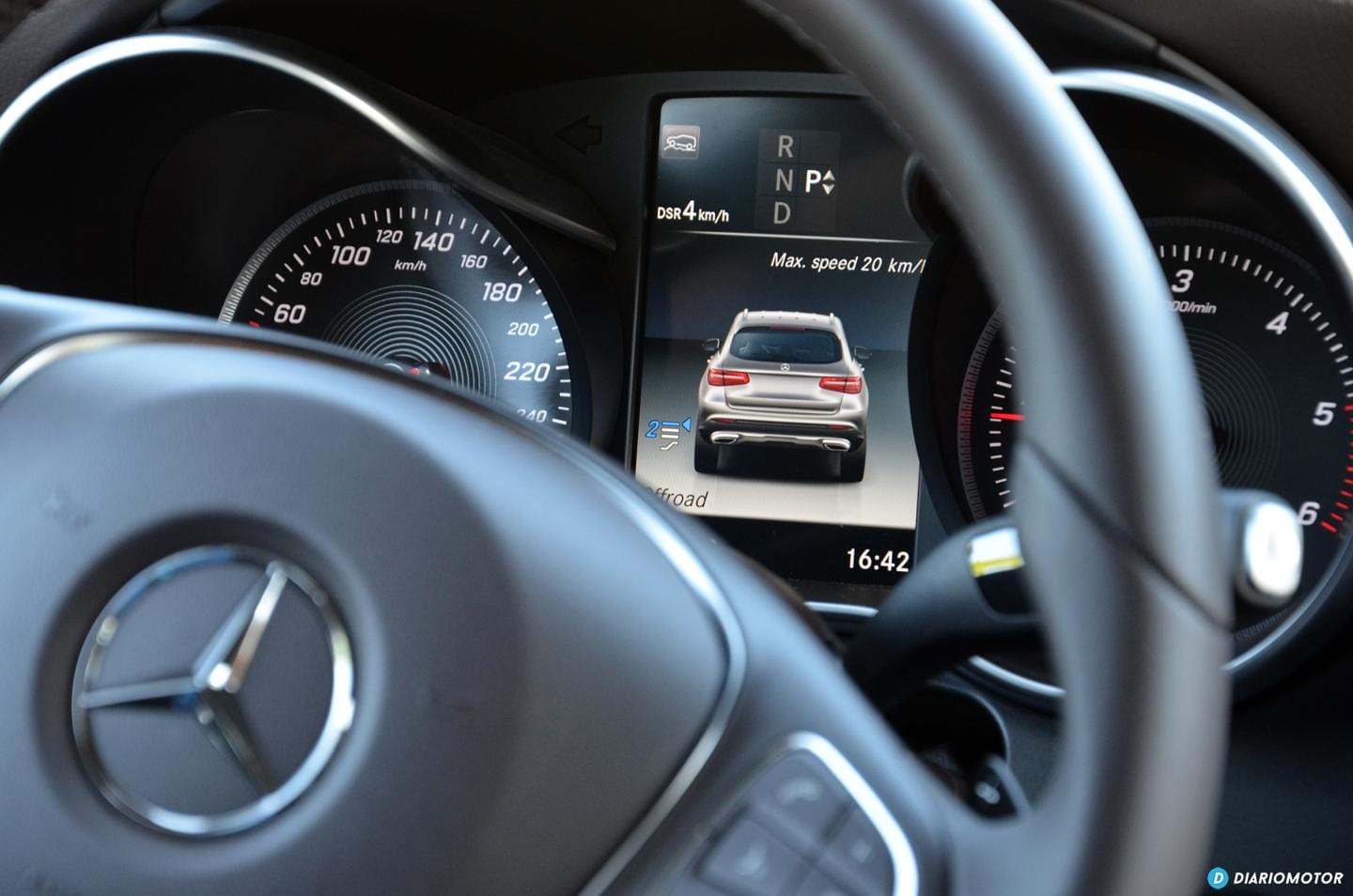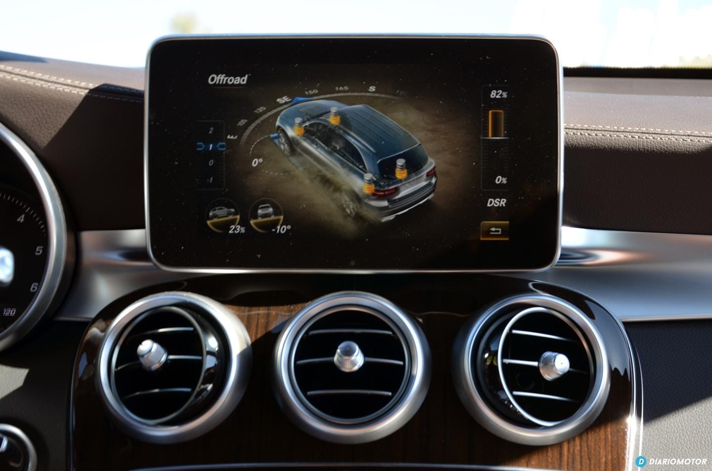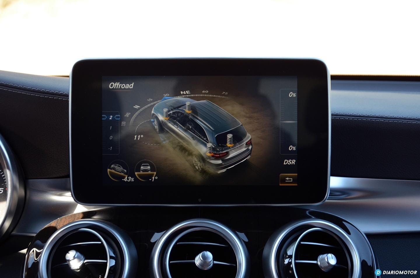 Contamos con hasta 5 modos de conducción específicos para off-road, donde cada programa impone unas leyes de trabajo muy concretas para el sistema de tracción total 4MATIC, el control de estabilidad para controlar la diferencia de velocid entre ruedas o la cantidad de par que llega a cada rueda esté o no en el suelo. El trabajo del sistema es totalmente transparente y no necesita de ningún tipo de implicación por parte del conductor más allá de la selección de los programas de conducción. Aún así, a través de la pantalla HD de 7 pulgadas podemos ver excelentes gráficos sobre el trabajo del GLC con datos sobre inclinación longitudinal o lateral, velocidad de descenso programada, dirección de la marcha, etc.