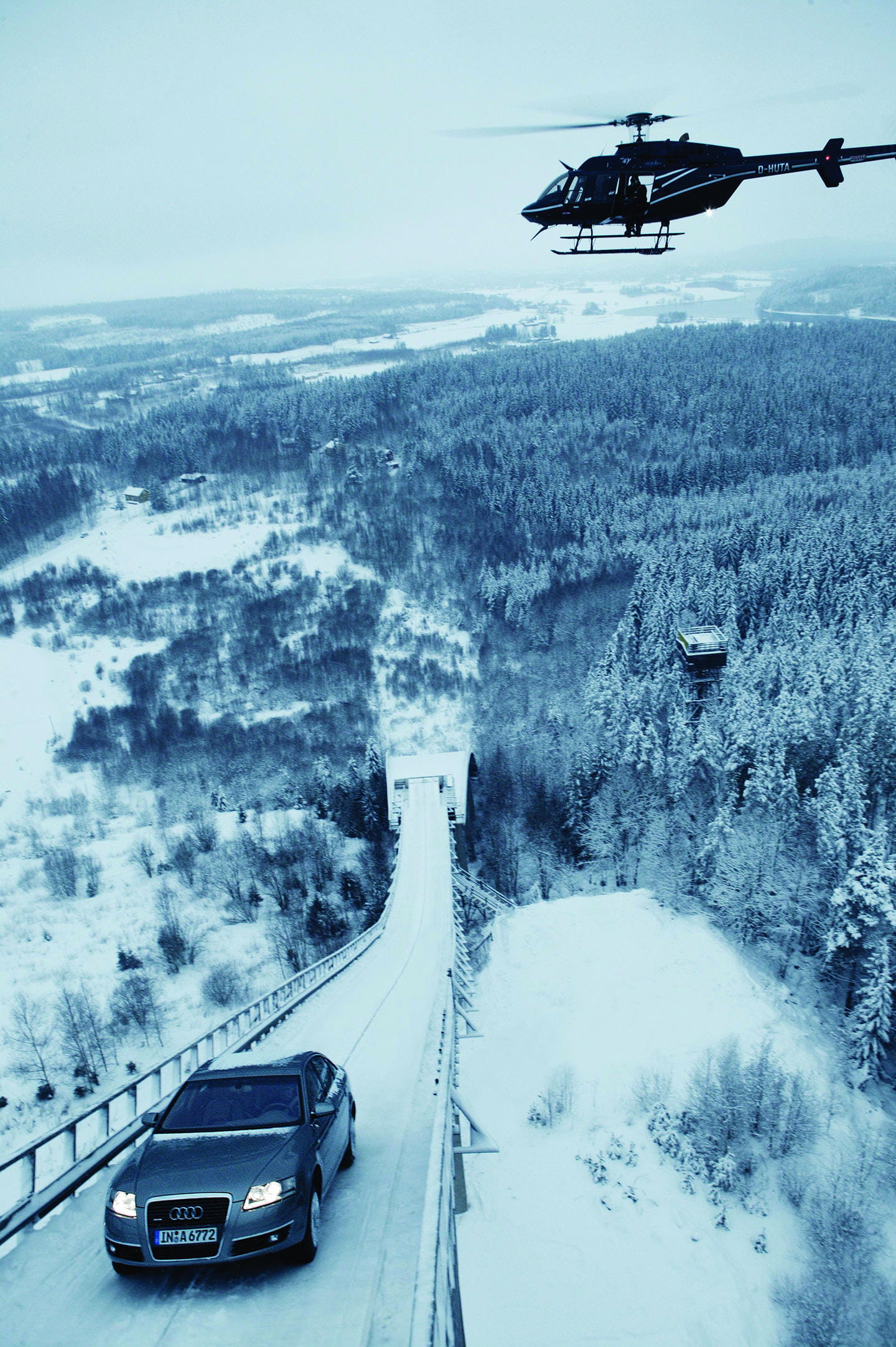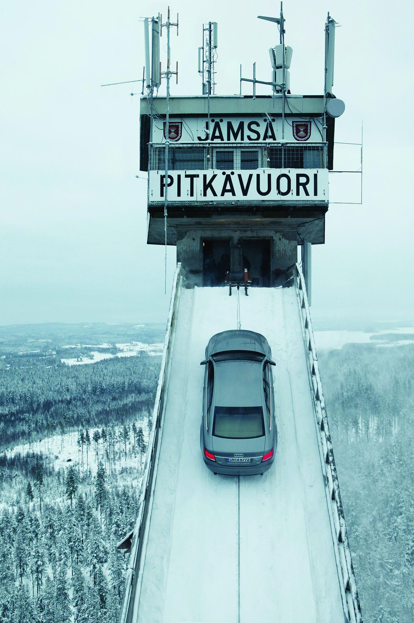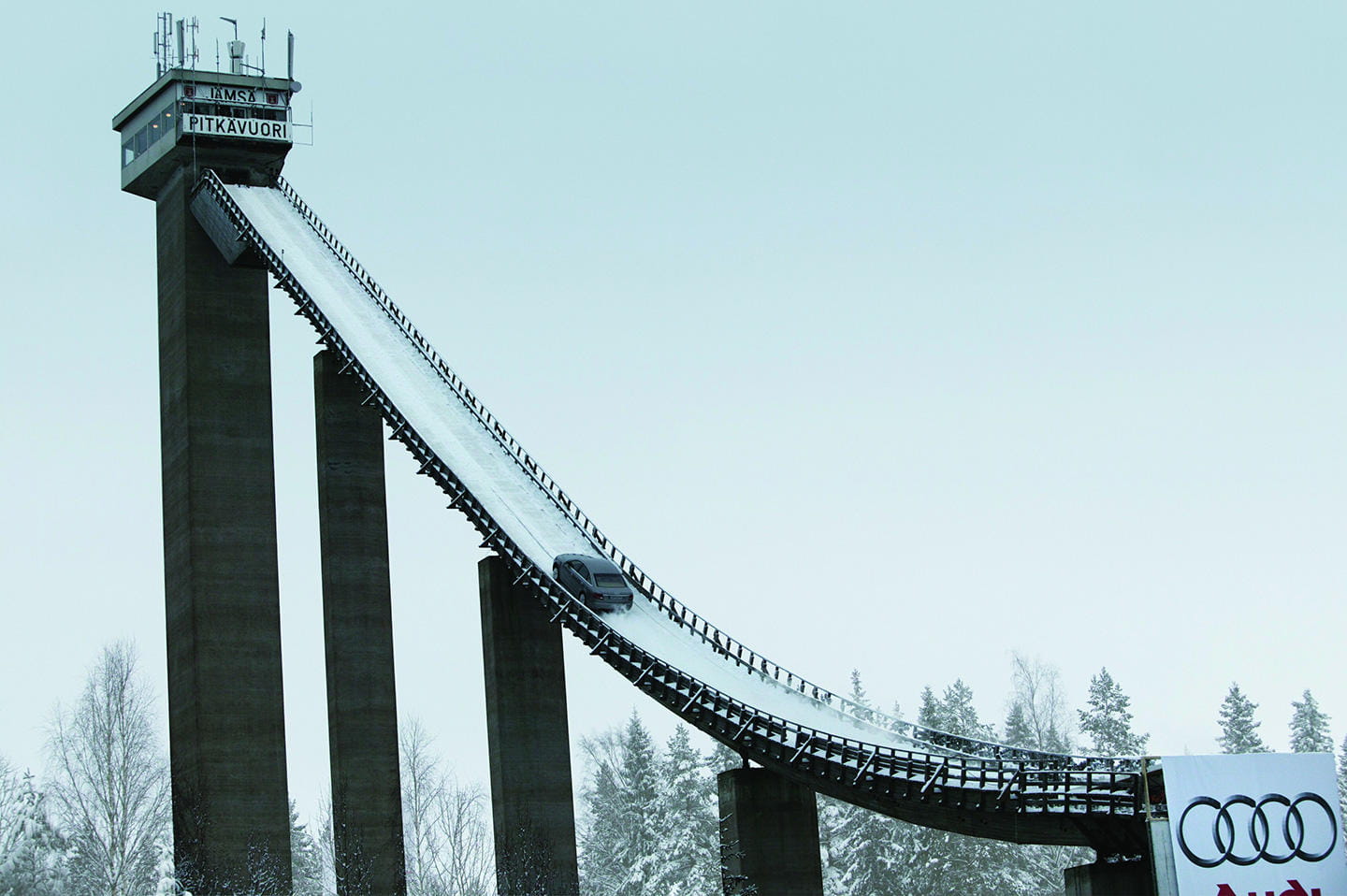 Kaipola, Finlandia. Año 1986. – 20ºC. Harald Demuth asciende a una plataforma de 61 metros de altura sobre el suelo, mira a su alrededor, y se encuentra con un inmenso bosque cubierto de nieve y hielo, y una plataforma con una inclinación de 37,5º, una pendiente del 80%. Según reconocería en una entrevista años más tarde (ver entrevista en alemán) era imposible contener los nervios. Tras este vistazo preliminar, Harald tendría que enfrentarse a escalar este trampolín de salto de esquí en un Audi 100 CS quattro rojo con 136 CV de potencia. Aquella hazaña quedaría registrada en vídeo y protagonizaría uno de los anuncios de coches más famosos de la historia. Una acrobacia no exenta de riesgos, ni complejidades técnicas, y es que aquello suponía un reto incluso para el mejor todoterreno del momento. ¿Hubo truco? ¿Cómo se prepararon para aquella hazaña?