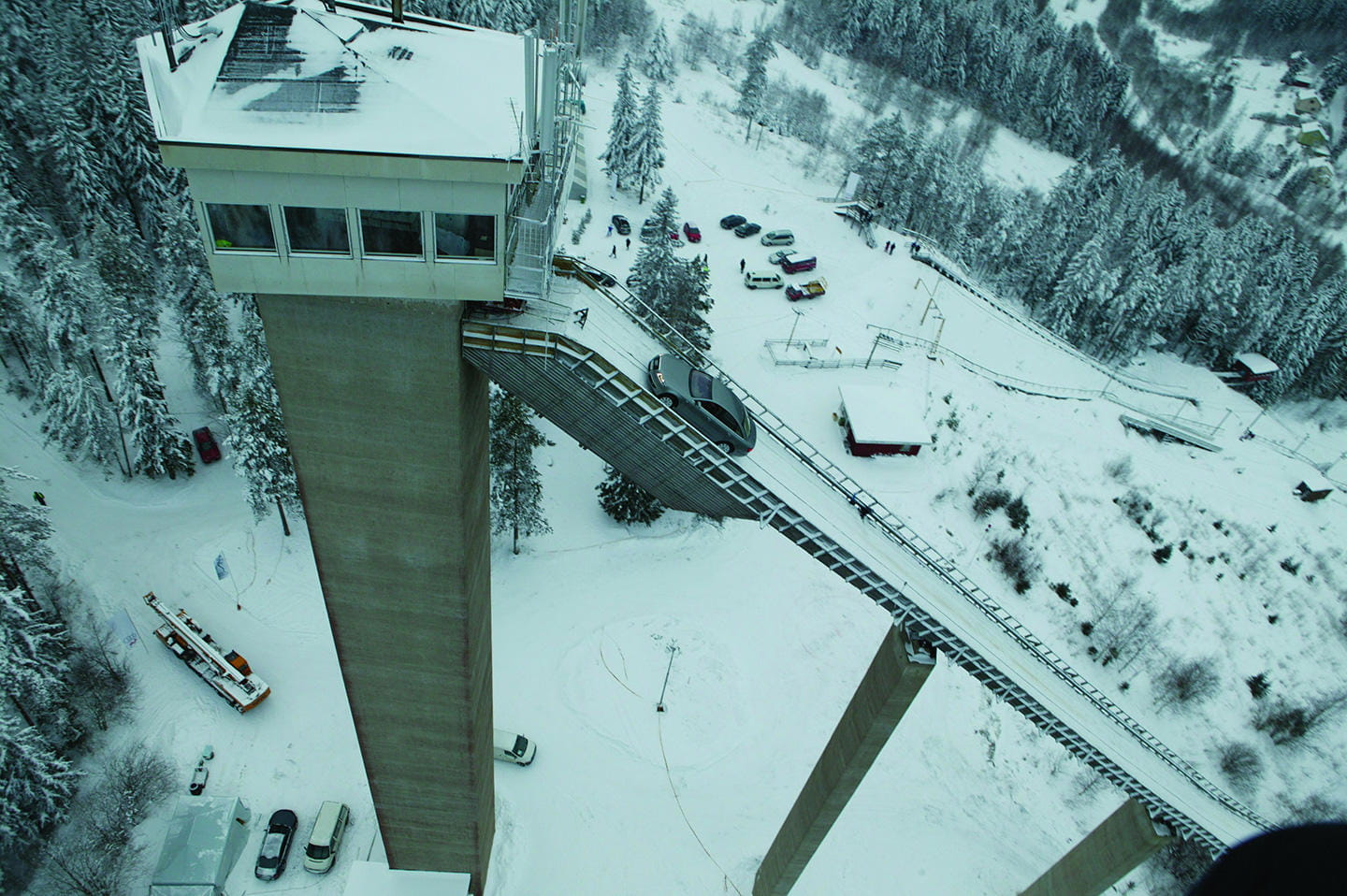 La complejidad del reto era mayor de la que te puedes imaginar. Harald no solo tenía que subir aquella plataforma una vez. En total tendría que repetir la maniobra en hasta 13 ocasiones. Aquellas imágenes tenían que quedar perfectamente retratadas, se utilizarían cámaras en el coche, una cámara instalada en la cima, en la base, y también se realizarían algunas tomas desde un helicóptero. El coche, antes de realizar la prueba, tuvo que elevarse con una grúa hasta la plataforma en la que se produce el salto de los esquiadores.