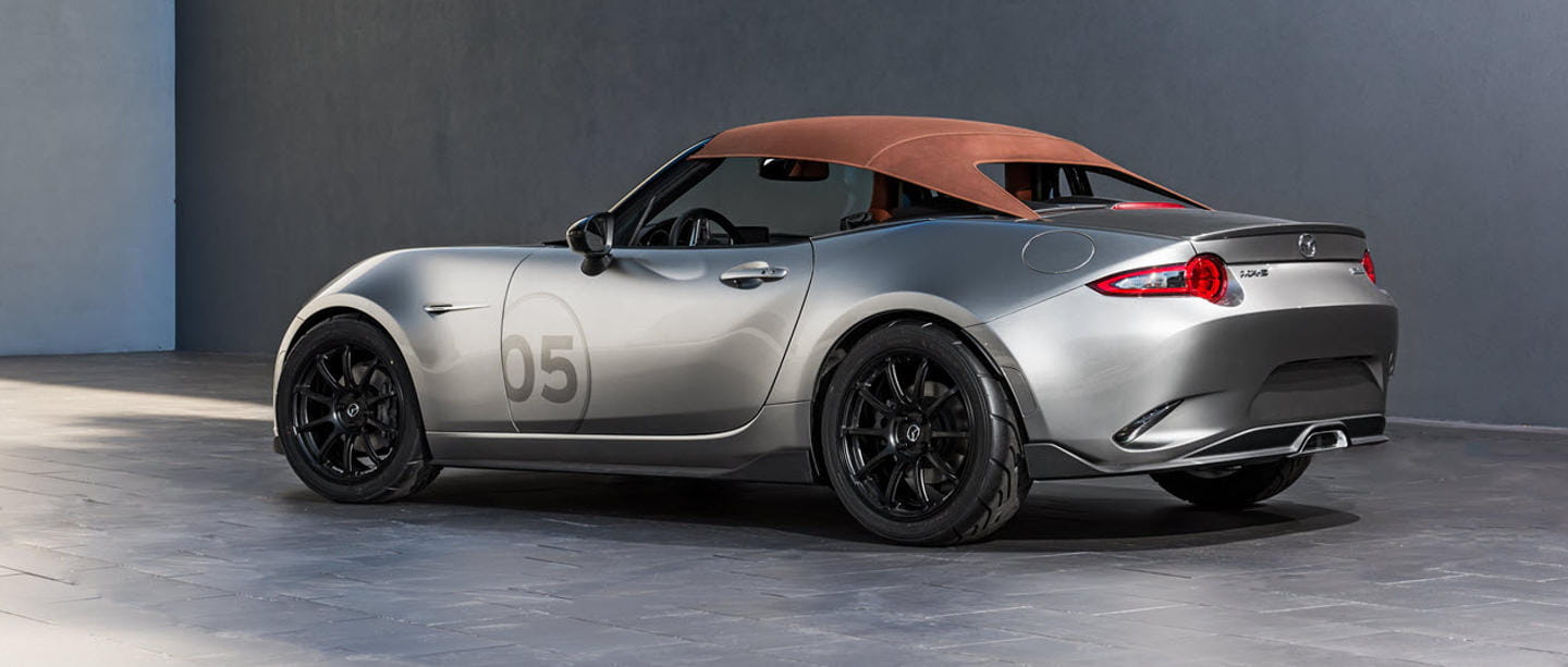 Por otro lado el Mazda MX-5 Speedster nos propone un radical Miata que prescinde de su parabrisas, ganando por el camino unas peculiares jorobas que sustituyen el espacio donde originalmente se plegaba una capota ahora inexistente.