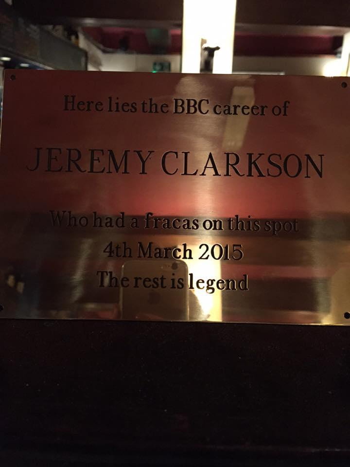 «Aquí yace la carrera en la BBC de Jeremy Clarkson, que tuvo una «gresca» en este lugar, un 4 de marzo de 2015. El resto es leyenda.» Tremendo epitafio.