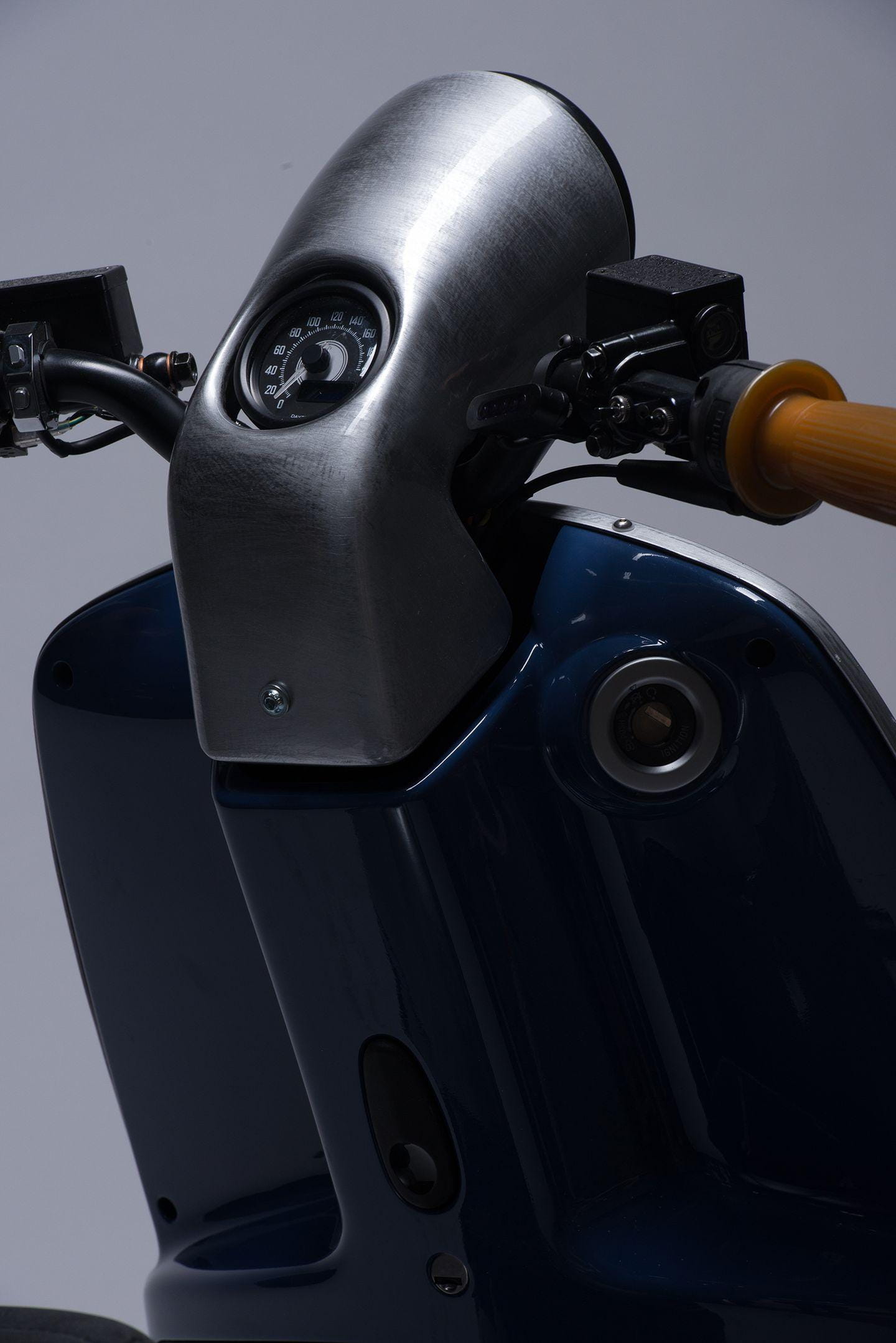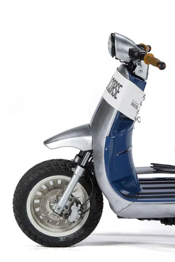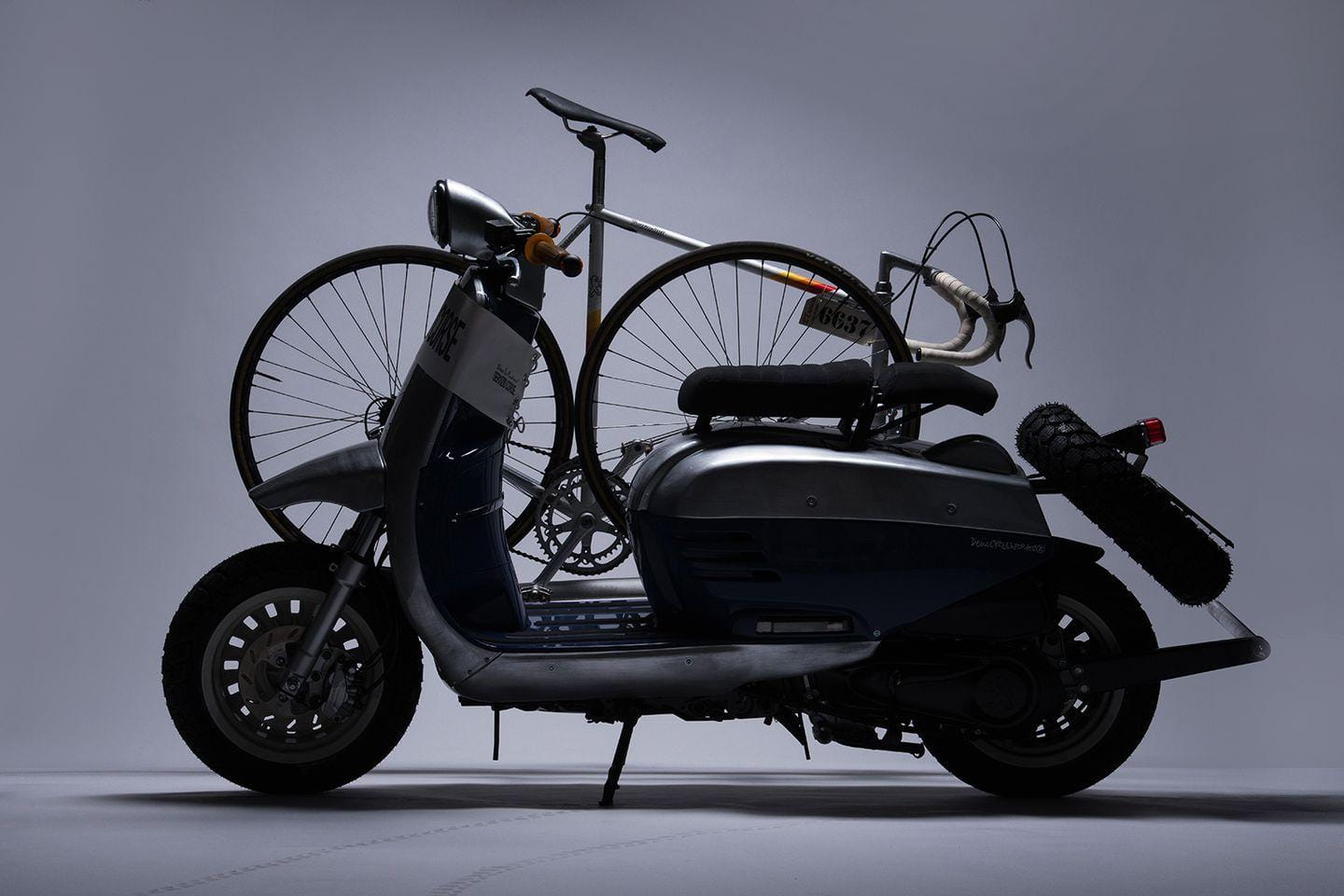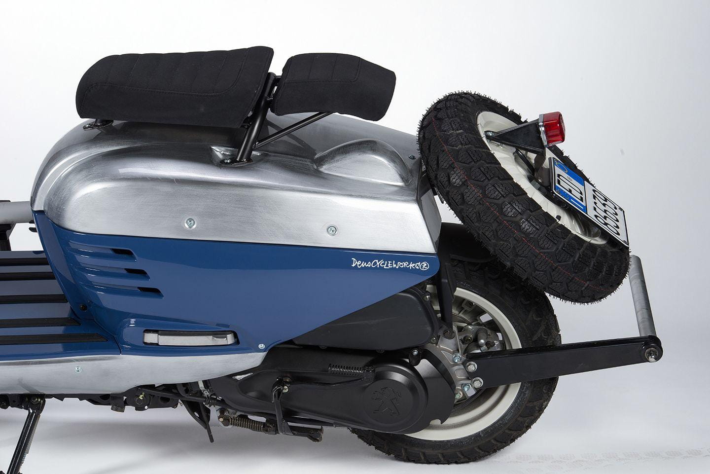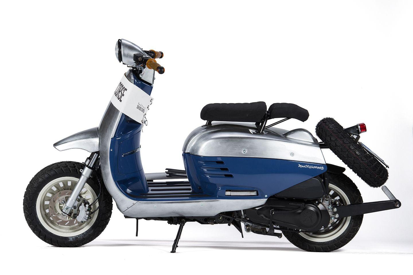 El asiento está separado del carenado, y el manillar es ahora fino, a la vista. Una óptica pequeña está enmarcada en un frontal con un bonito cartel de época y construido en metal pulido. Los neumáticos son todoterreno, montados sobre llantas de color blanco. Una tercera llanta de repuesto se monta en la parte trasera, imitando de forma elegante a las motos de época. El color azul de Peugeot está presente en parte del carenado, rematando junto al soporte de la bicicleta una creación de lo más bonita.