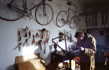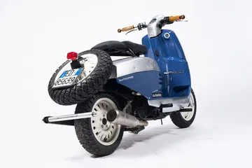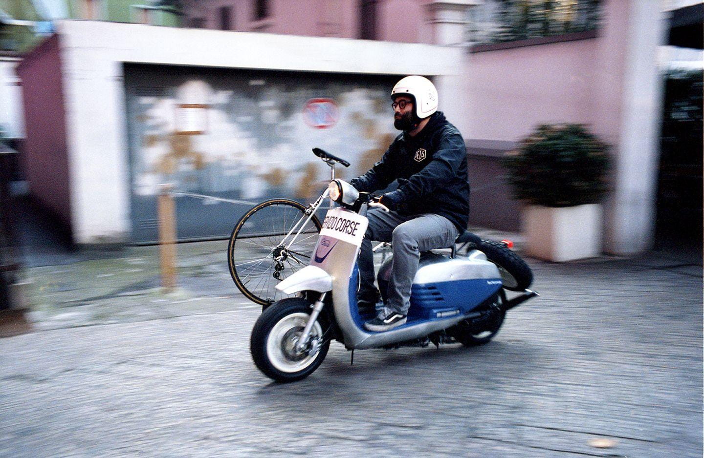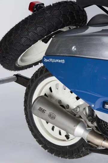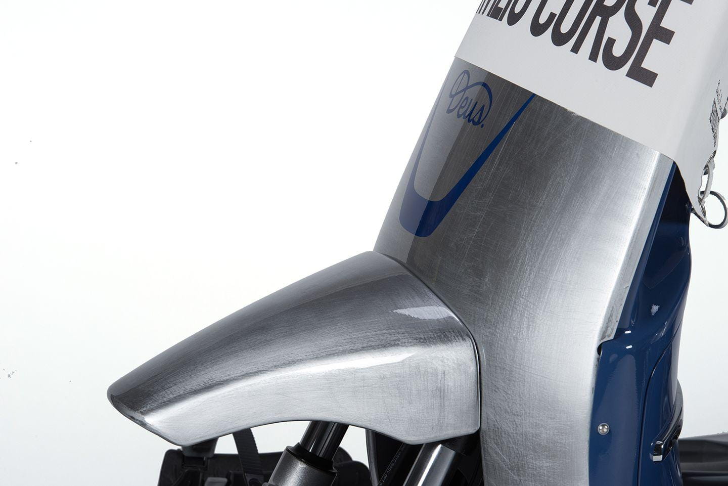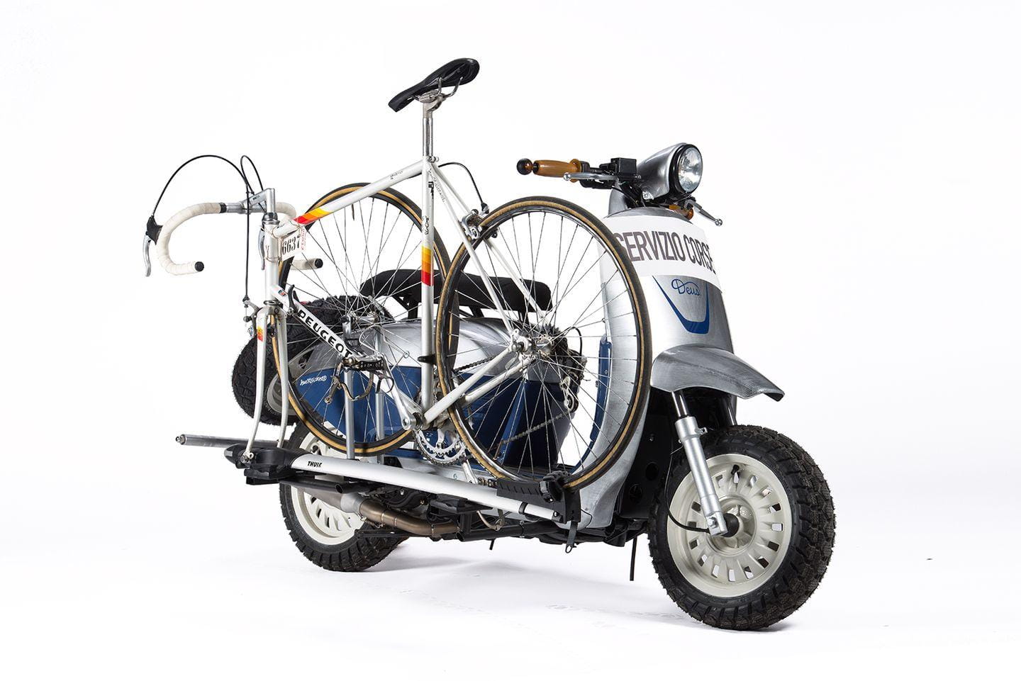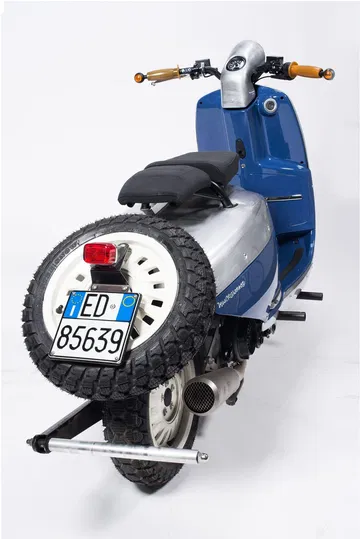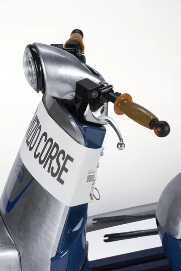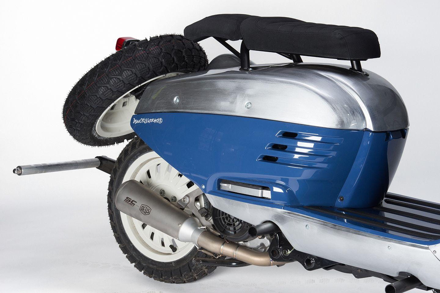 El asiento está separado del carenado, y el manillar es ahora fino, a la vista. Una óptica pequeña está enmarcada en un frontal con un bonito cartel de época y construido en metal pulido. Los neumáticos son todoterreno, montados sobre llantas de color blanco. Una tercera llanta de repuesto se monta en la parte trasera, imitando de forma elegante a las motos de época. El color azul de Peugeot está presente en parte del carenado, rematando junto al soporte de la bicicleta una creación de lo más bonita.