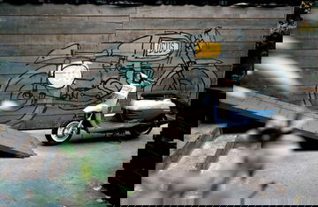 El asiento está separado del carenado, y el manillar es ahora fino, a la vista. Una óptica pequeña está enmarcada en un frontal con un bonito cartel de época y construido en metal pulido. Los neumáticos son todoterreno, montados sobre llantas de color blanco. Una tercera llanta de repuesto se monta en la parte trasera, imitando de forma elegante a las motos de época. El color azul de Peugeot está presente en parte del carenado, rematando junto al soporte de la bicicleta una creación de lo más bonita.