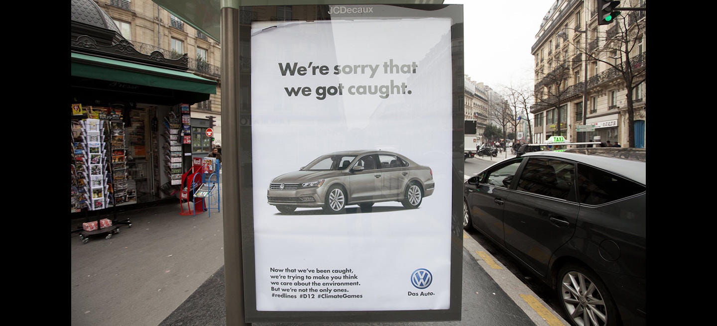 «Sentimos que nos hayan pillado», se podía leer en las paradas de autobús de París estos días, en un anuncio aparentemente patrocinado por Volkswagen. «Ahora que nos han pillado, intentaremos hacerte pensar que nos preocupamos del medio ambiente. Pero nosotros no somos los únicos». El caso de Volkswagen no es más que la punta del iceberg, un oportuno recordatorio de cómo la responsabilidad social de la marca, a menudo, no es más que un juego de apariencias e imagen, puesto que al final lo único importante para una gran corporación es generar beneficios, y cuanto mayores sean mejor.