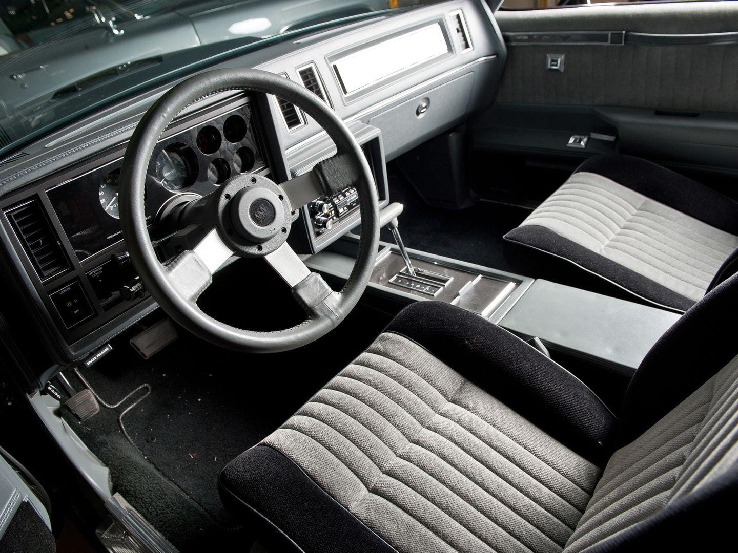 Su interior era tan oscuro como su exterior. Ni un solo cromado a la vista, sólo pasos de rueda ensanchados, neumáticos de alto rendimiento montados sobre llantas de 16 pulgadas y más aberturas de refrigeración. Sólo un emblema en su calandra dejaba ver que estábamos ante uno de los Buick más especiales jamás creados. Lo que quizá no sabíais era que General Motors obligó a Buick a rebajar la cifra de potencia declarada, ya que el Corvette más potente sólo desarrollaba 240 CV en el mismo año. Buick obedeció, pero en realidad, la potencia del coche era muy superior.