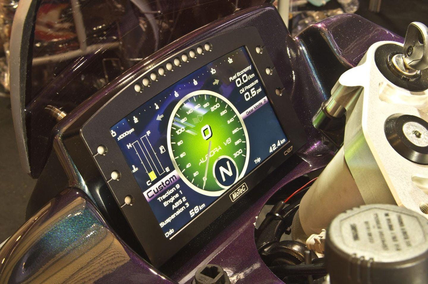 Definitivamente, es necesario estar loco de remate para pilotar una moto así. El motor es un nuevo desarrollo, un V8 de carrera muy corta y sólo 2.575 centímetros cúbicos de cilindrada. Con doble árbol de levas en cabeza, es un motor capaz de desarrollar 417 CV a 9.500 rpm, acompañados de un par máximo de 319 Nm a 7.000 rpm. Son cifras propias de cualquier deportivo de altas prestaciones con cuatro ruedas, y me recuerdan en parte a las que un preparador japonés logró al juntar dos motores de moto en un Subaru BRZ.