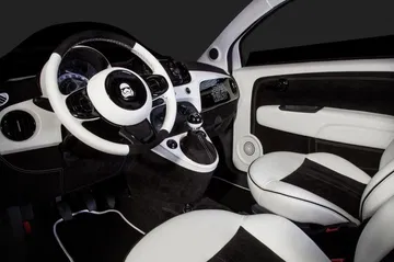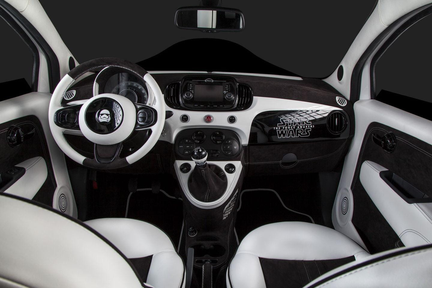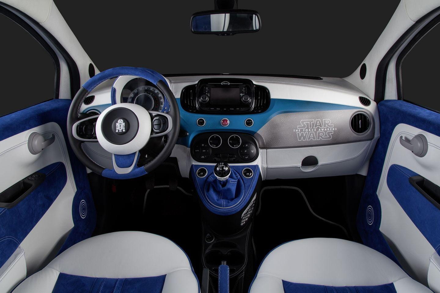 Principalmente porque su esquema de colores blanco y naranja se replica en forma de vinilo también en los cristales del coche. Incluido el parabrisas, que no deja siquiera un hueco para que el conductor pueda ver hacia fuera, limitando su función a un simple objeto promocional. De nuevo, el interior del coche ha sido tapizado con los mismos colores del astrodroide, combinaciones de gris oscuro, blanco y naranja. De alguna manera, la combinación resulta más agraciada que la estrenada por el 500 disfrazado de R2-D2.