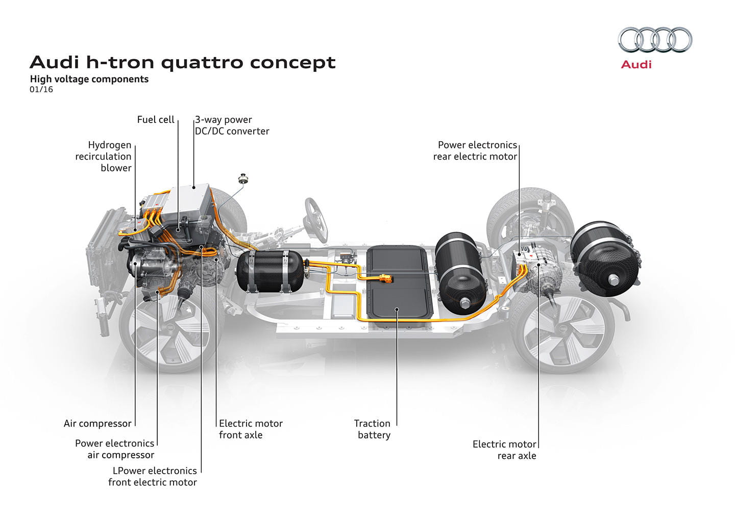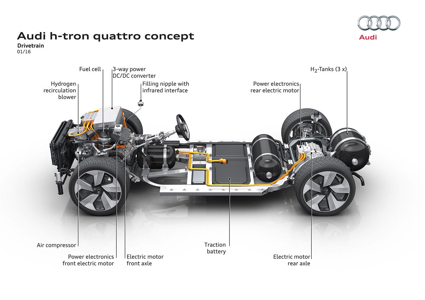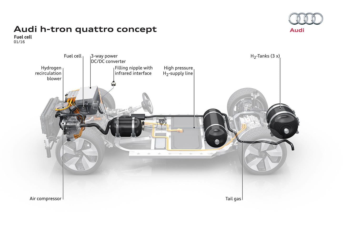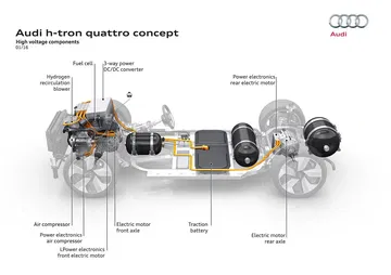 Este prototipo está construido sobre la segunda generación de la plataforma modular para aplicaciones de motor longitudinal. Es interesante mencionar que tanto el e-tron como este h-tron se basan en la misma plataforma, pese a contar con soluciones mecánicas tan diferentes (por los requisitos técnicos de acumulación energética que requieren).