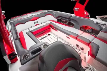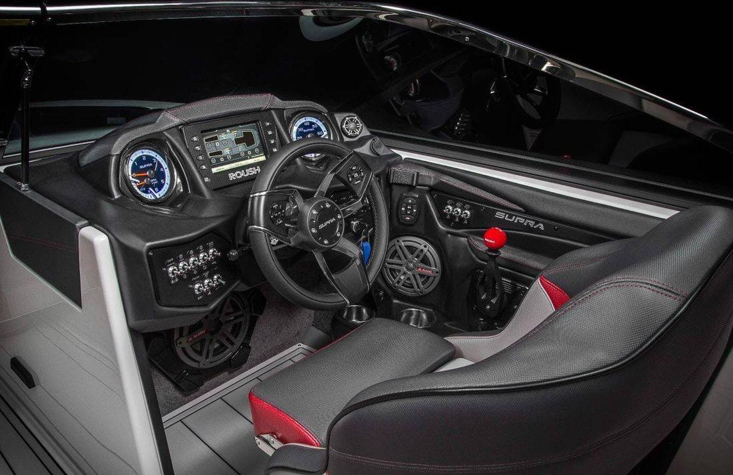 El logotipo de Roush se puede encontrar en los asientos y en diferentes partes del casco Un asiento deportivo de cuero y racks de carga de aluminio, mecanizados a partir de un bloque sólido de aluminio. Un sistema táctil de infoentretenimiento aglutina las funciones de audio, GPS y monitorización del estado de la lancha. La guinda al pastel lo pone un equipo de sonido JL Audio de altas prestaciones compuesto de varios altavoces, subwoofer y amplificadores. Para montarse una buena fiesta sobre el agua.