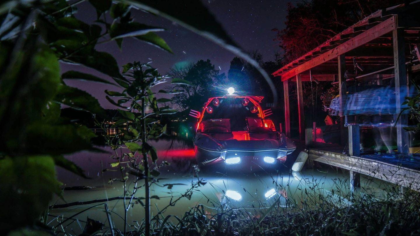 Además de un motor de enorme potencia, la lancha tiene un aspecto amenazador. Su casco ha sido decorado con motivos de colores agresivos, y se ha instalado una cubierta para el puesto de pilotaje, con luces que imitan a las luces de un todoterreno. El interior de la lancha y su puesto de pilotaje sí parece sacado de un coche. Tenemos un volante de aspecto dinámico, instrumentación con fondo azul, velocímetro y cuentavueltas, así como una palanca de acelerador con un pomo rojo. No, este tipo de lanchas no tienen pedales.