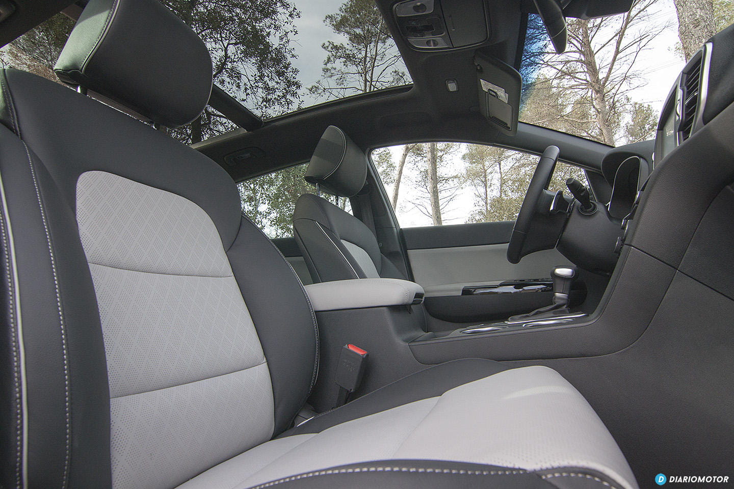 Los asientos delanteros son cómodos, con multitud de reglajes incluyendo un buen apoyo lumbar, pero carecen de la sujección lateral suficiente para practicar una conducción decidida. No es este un coche para ir por el mundo «de tramo», pero como veremos más adelante sí se deja conducir con cierta alegría.