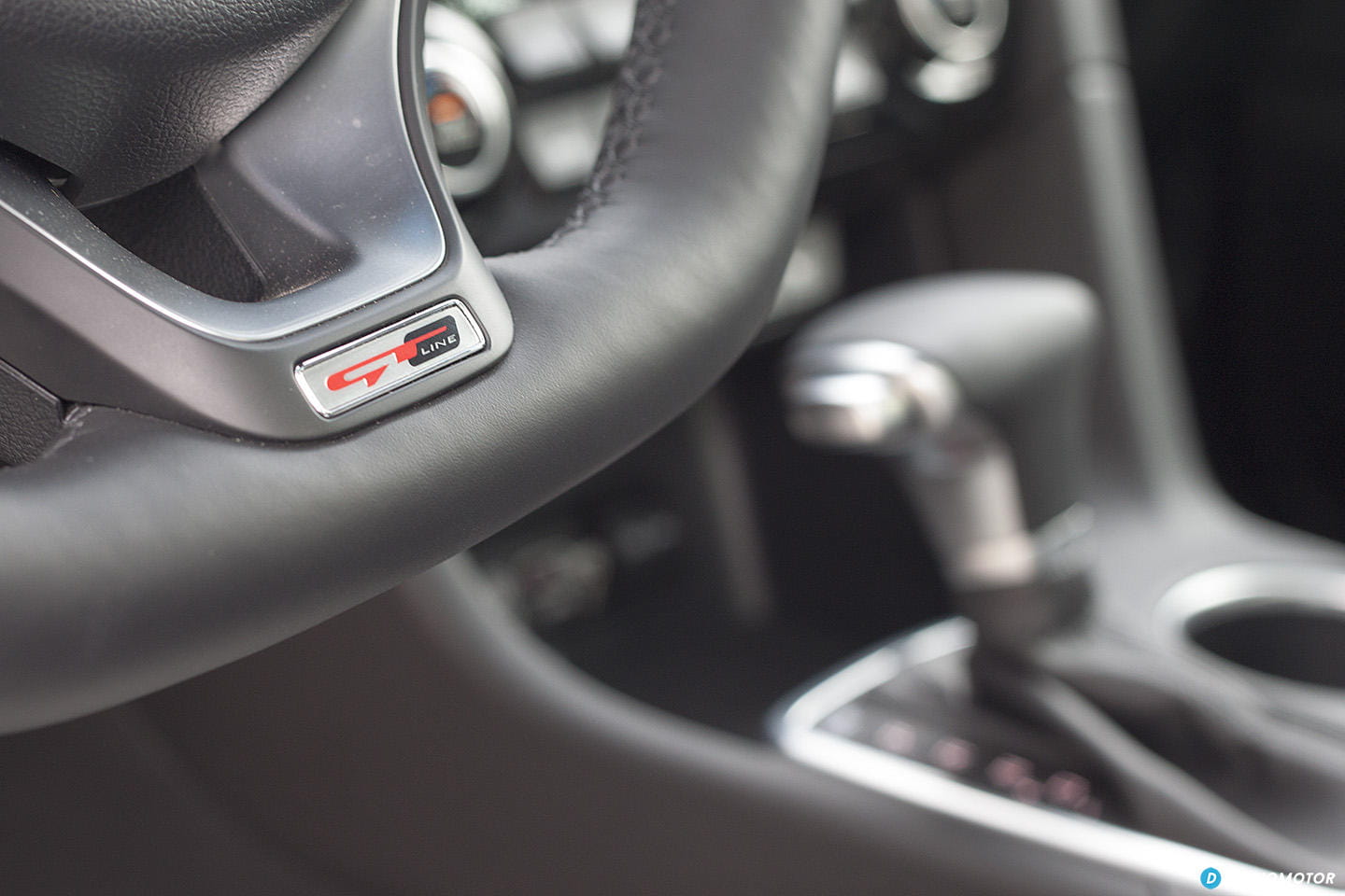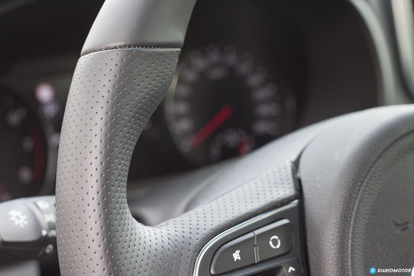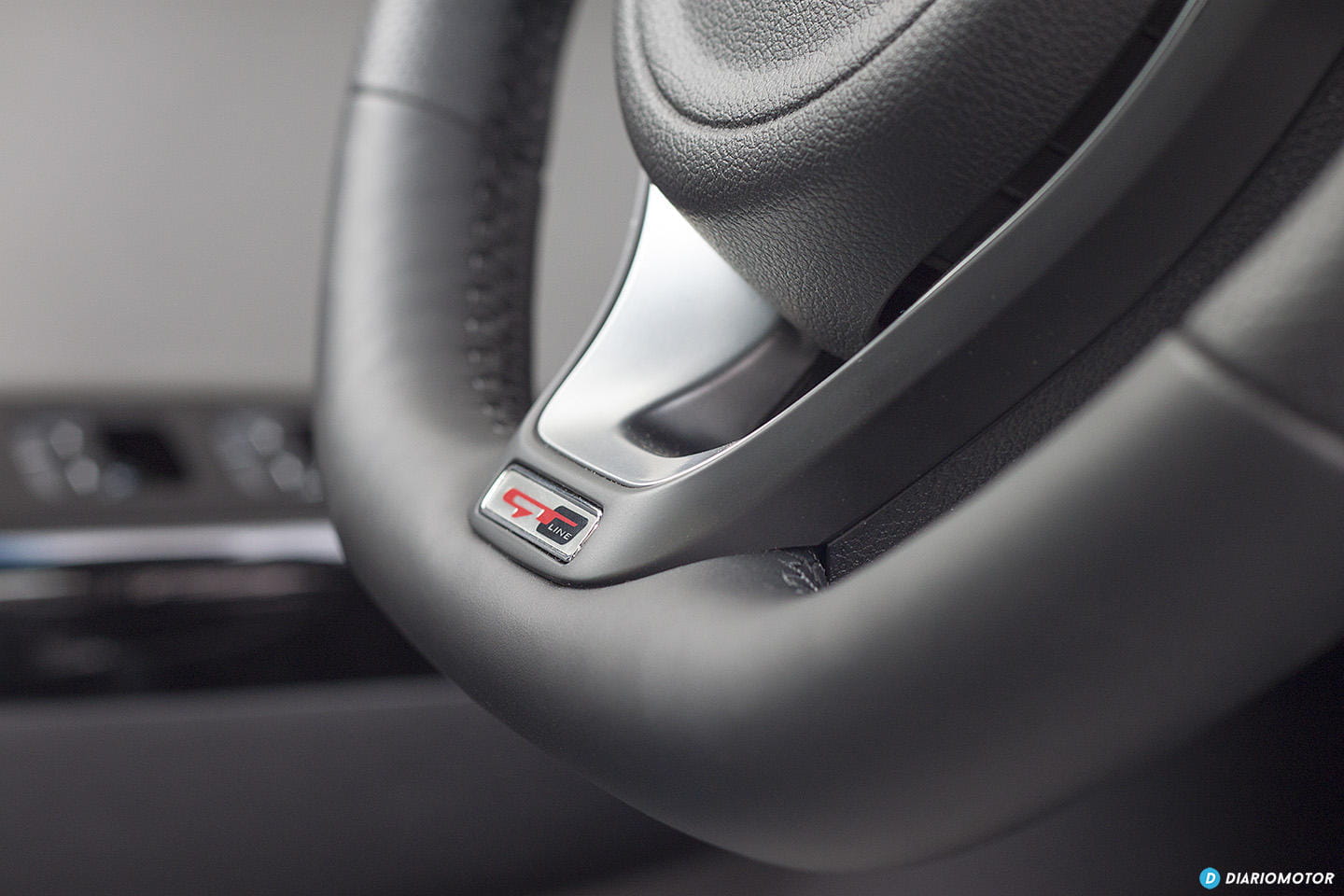 Los tapizados resultan agradables a la vista y al tacto y el punto crucial del aro del volante está recubierto en una piel de primera calidad, siendo muy agradable al tacto, de un diámetro pequeño y con la parte inferior recta en el acabado GT Line. Los mandos del volante (pequeñas palancas y botones) están a la altura del resto del coche en diseño y agrado de utilización.