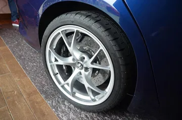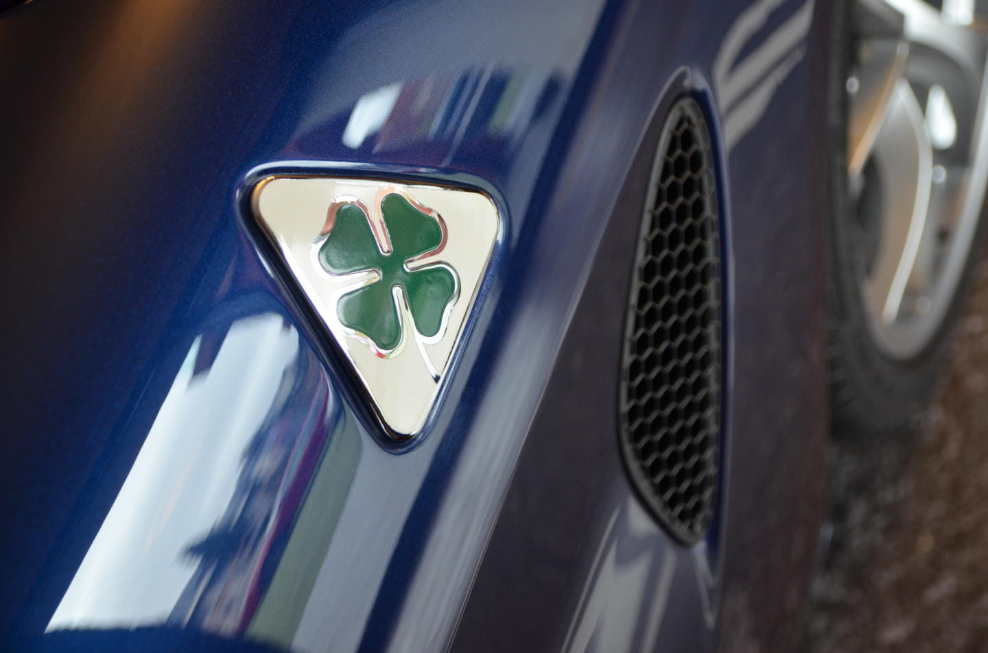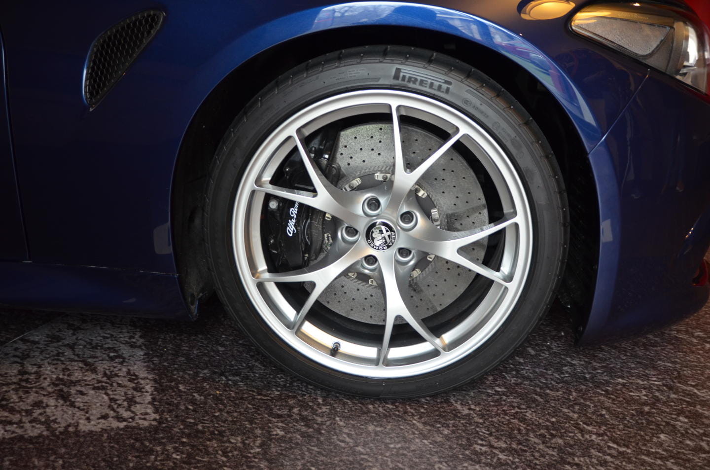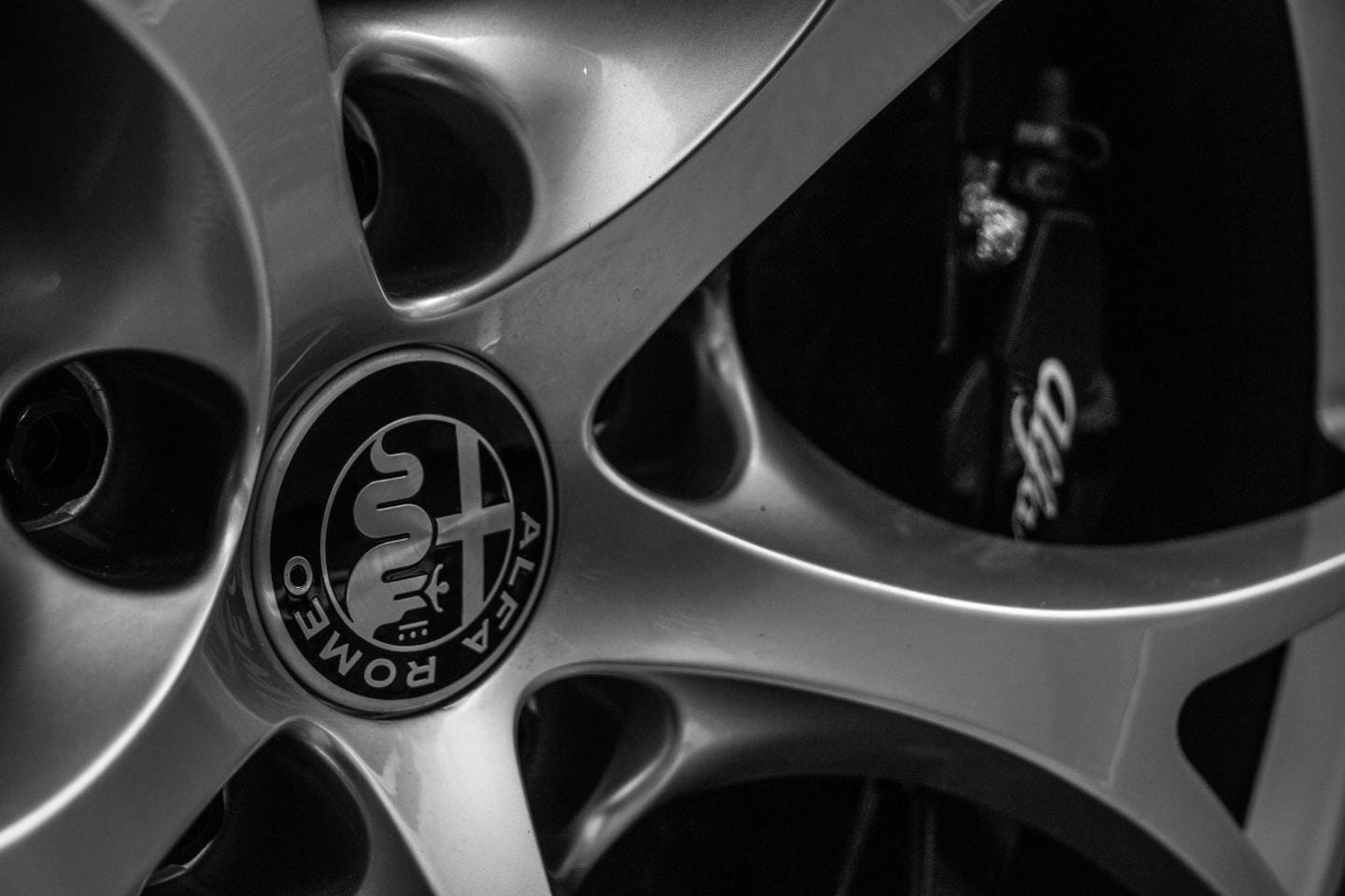 Prosigue mi vuelta alrededor de este italiano. Me gusta el diseño de sus llantas, de 19 pulgadas y cinco estilizados radios en forma de “Y” tras los que se esconde un gran disco de freno y una pinza de freno negra sobre la que se ha impreso un “Alfa romeo” con una bonita grafía. Por encima de esta llanta una branquia que colabora activamente en ese músculo que destila esta berlina y más allá el clásico trébol en una clásica, bonita y bien engarzada placa sobre la aleta.