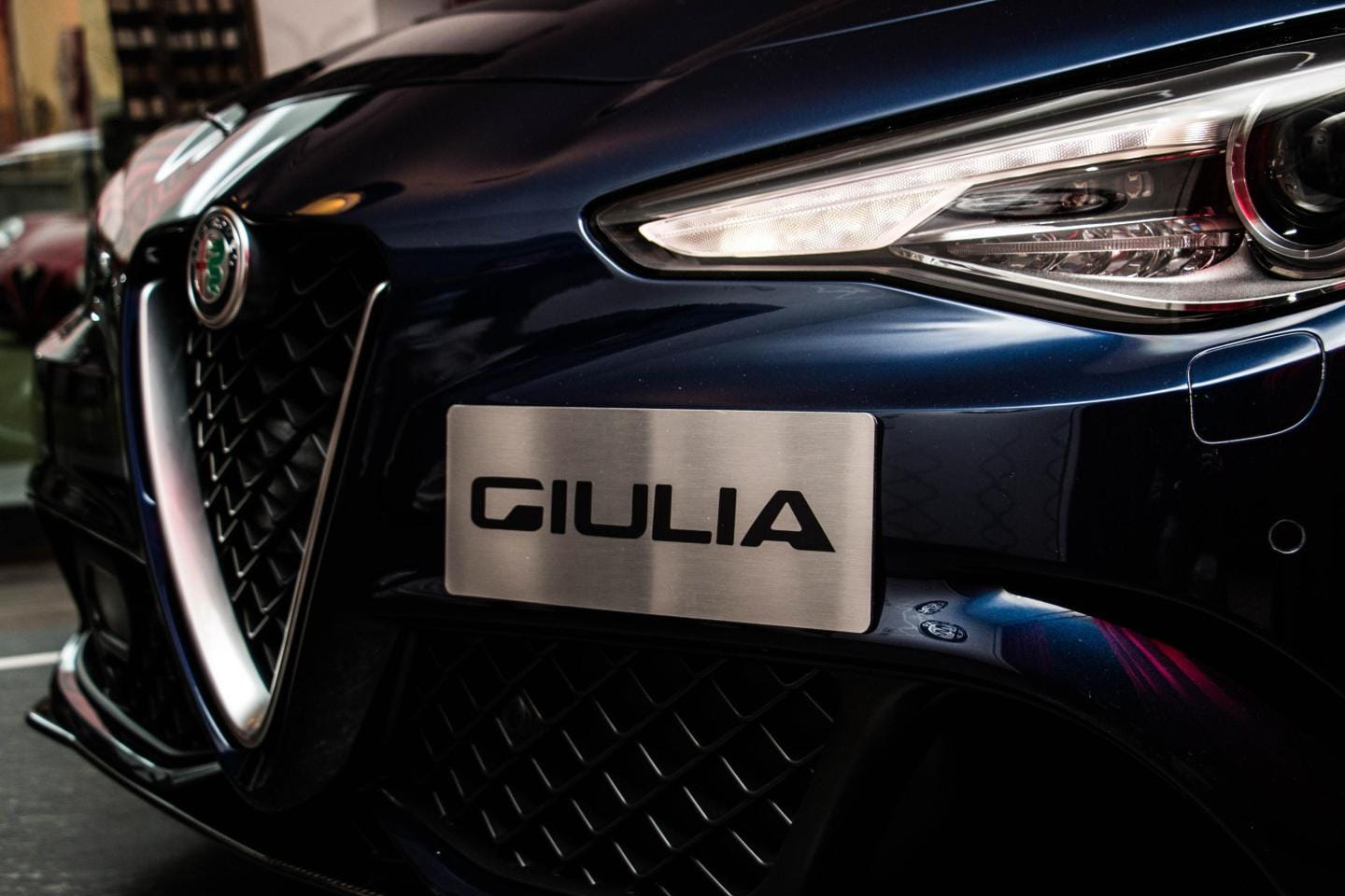 La unidad que ha traído Alfa Romeo España luce un tono azulado que bajo la luz del flash de la cámara deja entrever ciertos matices adicionales, un toque como de purpurina. Me gusta ese capó, me gustan sus nervaduras, ventiladas, dirigiéndose hasta la parrilla frontal. Bonita estampa la del frente de este Giulia, esas tomas inferiores, la matrícula a un lado, sus ópticas con ese destello LED…