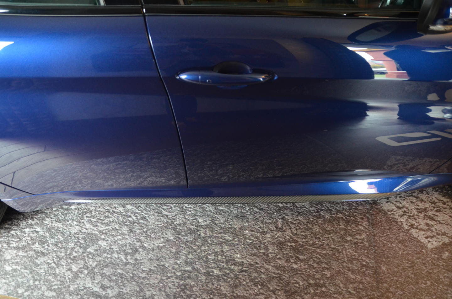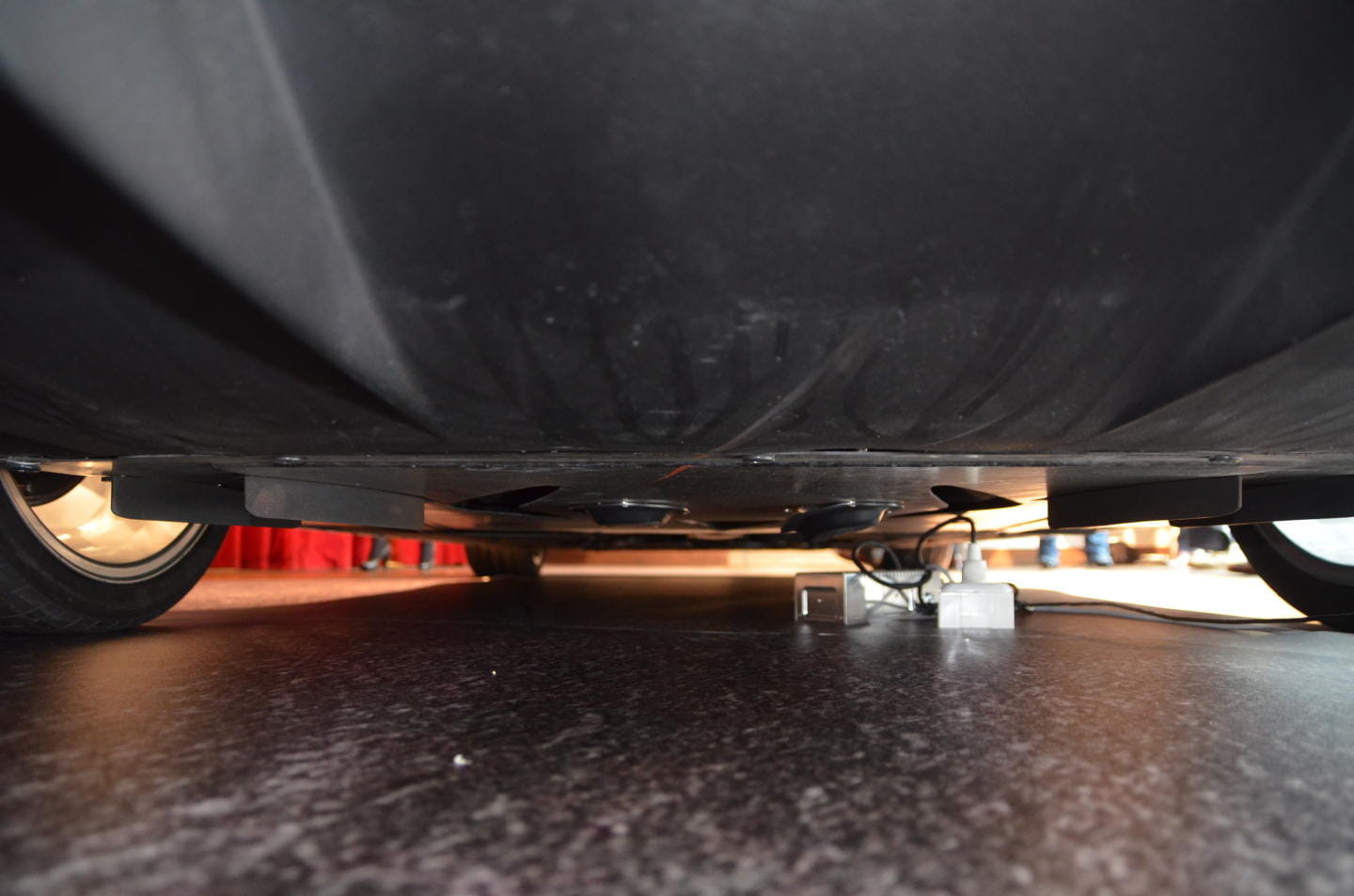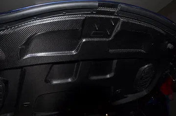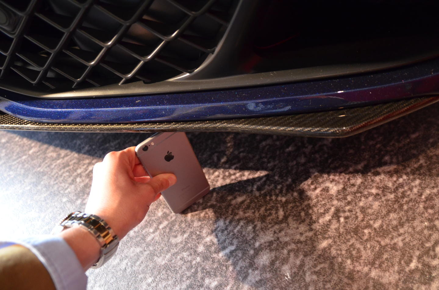 Recorro el lateral pendiente de esa talonera también confeccionada en fibra de carbono y llego a su zaga, una zaga donde de nuevo la fibra de carbono se encuentra presente, en su alerón de tipo lip, una zaga donde nuestra mirada se dirige automáticamente a esas salidas de escape, a ese difusor. Me asomo bajo el coche, planto la cámara y mi vista y el objetivo de mi cámara sólo llega a ver una suerte de fondo aparentemente plano.