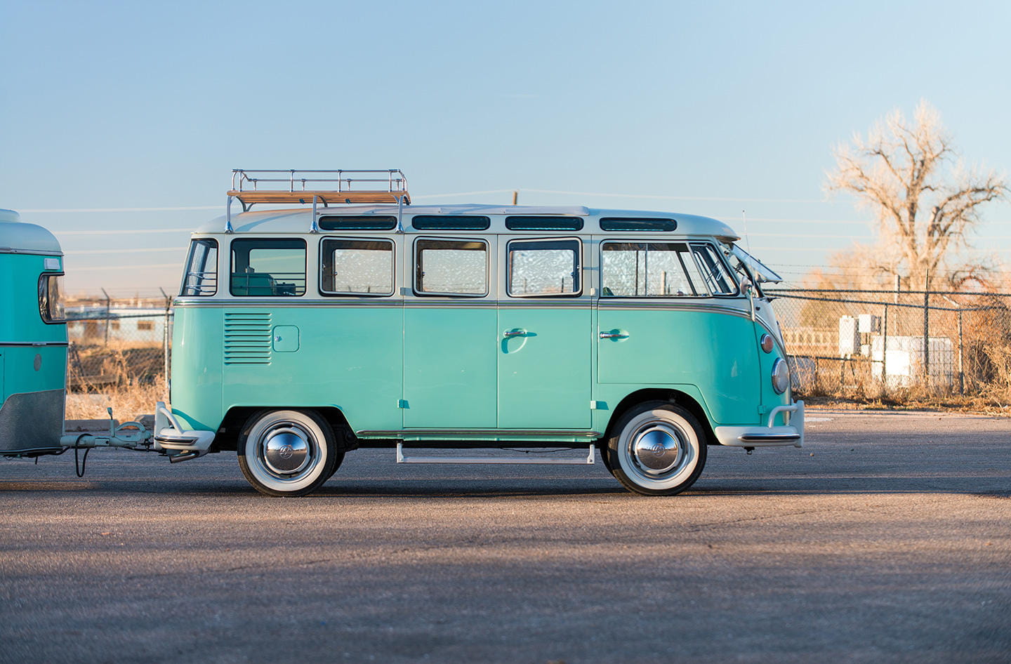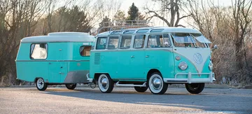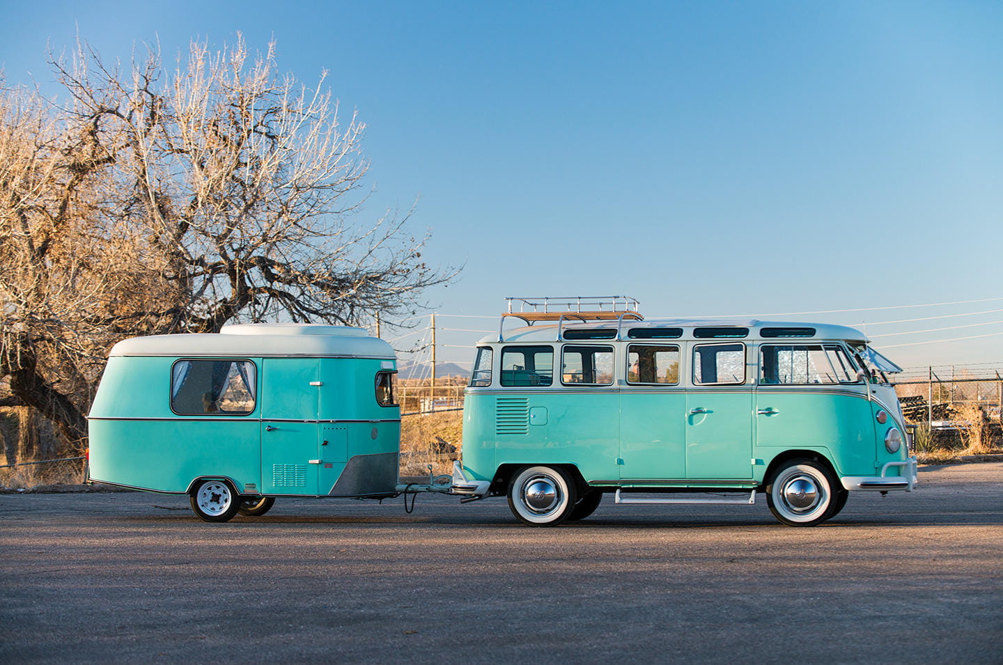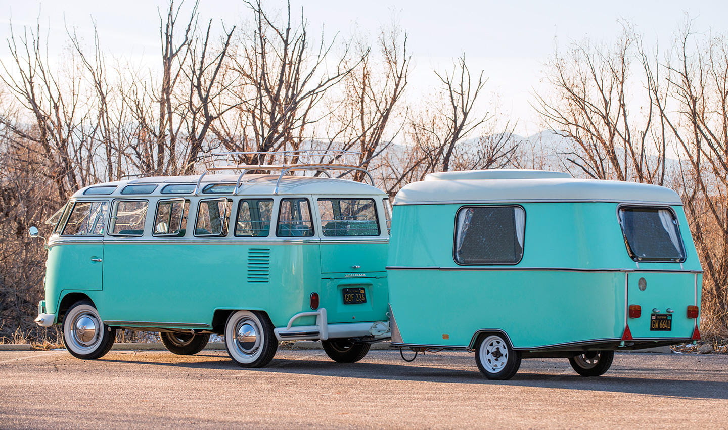 No solo se trata de una de las furgonetas más cotizadas del mercado de clásicos, una Volkswagen Type 2 T1 de 1963, sino que además cuenta con su luneta frontal partida y practicable estilo «safari». Pero eso no es todo. El remolque que arrastra es una caravana de tipo roulotte Eriba Puck original de 1967, una de las cinco que se estima que habrían sobrevivido el paso del tiempo, de nada más y nada menos que cinco décadas.