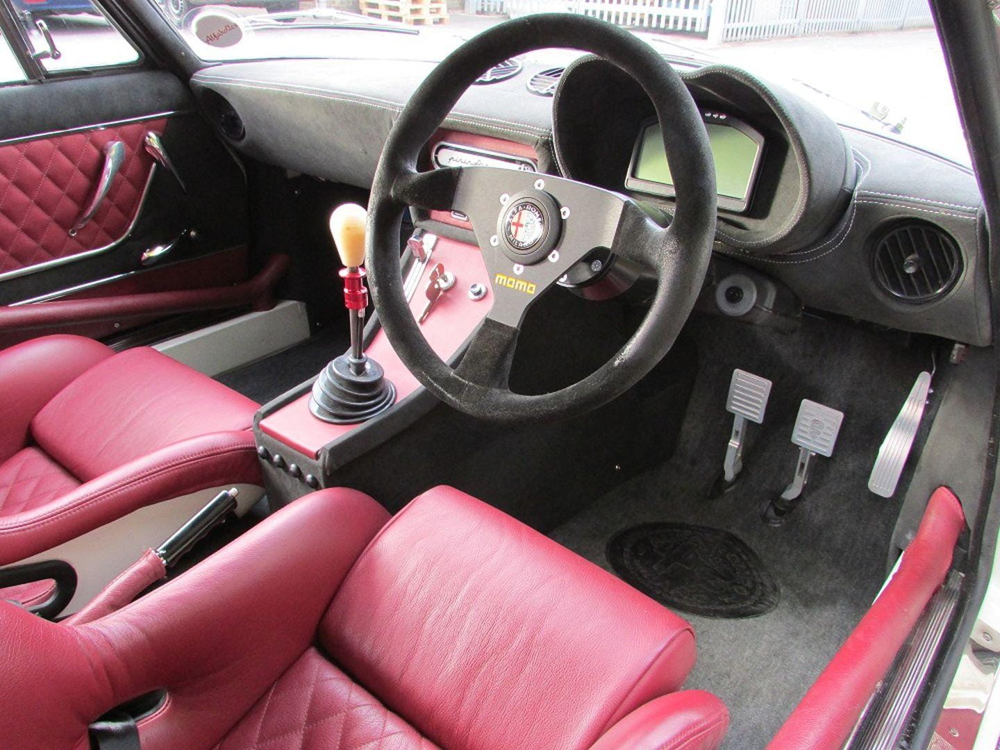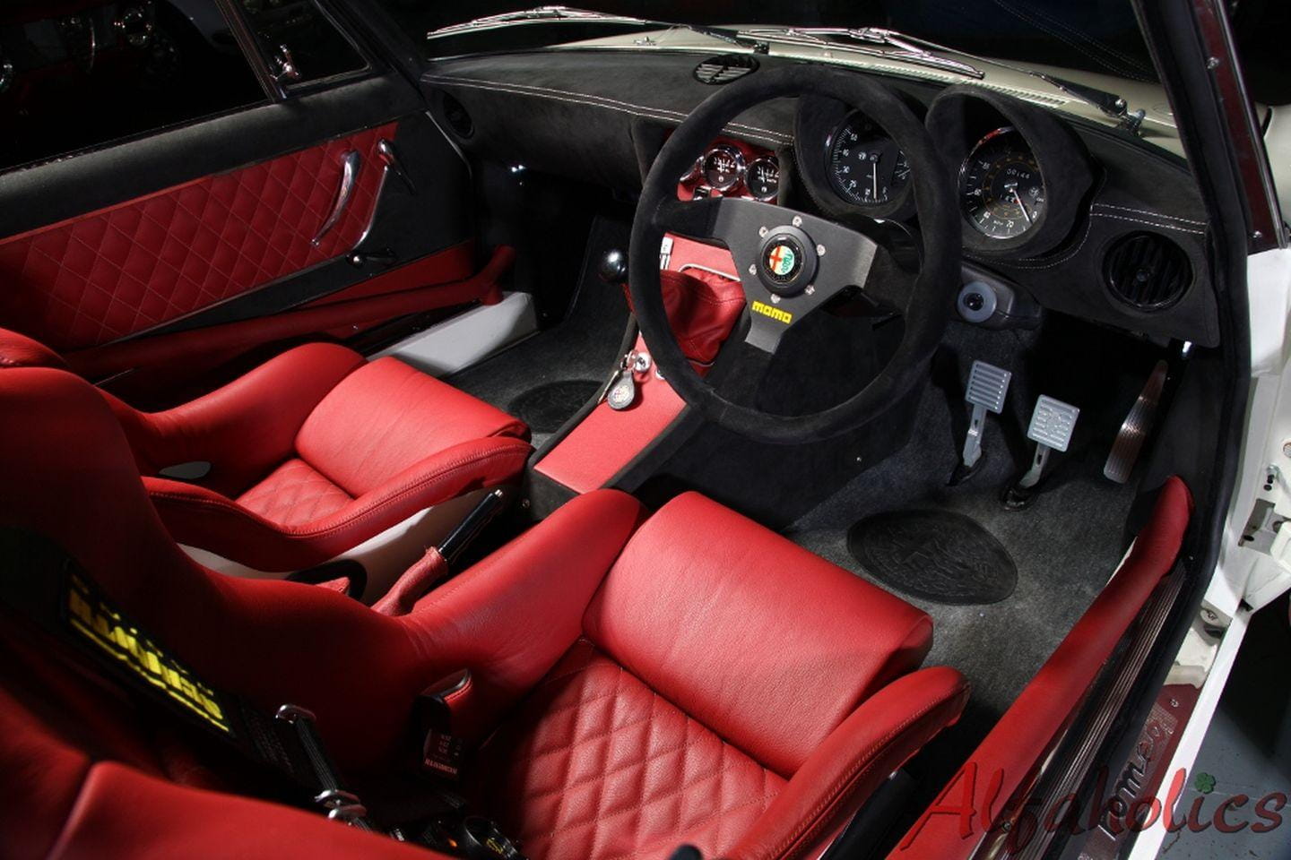Se le han instalado dos bacquéts tapizados en cuero diamantado, y el volante Momo procede de la competición. El coche fue entregado al cliente con la instrumentación analógica de los Spider, pero pronto decidió sustituirlo por un cuadro completamente digital, mucho más racing. También dejó a un lado la caja de cambios manual del descapotable, optando en la última modificación encargada por el dueño por una caja de cambios secuencial de seis relaciones, desarrollada por Alfaholics y más eficaz en circuito.