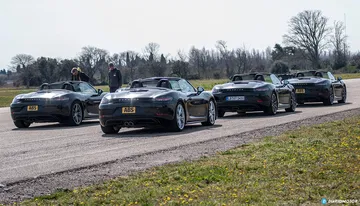 La razón por la cual ves a estos deportivos con una carrocería en negro es que están vinilados. En realidad se trata de prototipos, de unidades de pre-producción con las que Porsche ha estado trabajando la puesta a punto de los nuevos Porsche 718 Boxster. Sus especificaciones son definitivas, pero a la espera de su presentación en Ginebra estos días y su posterior presentación a la prensa, aún conservan el vinilado que ha utilizado Porsche para ocultarlos, por decirlo de alguna forma, de miradas indiscretas.