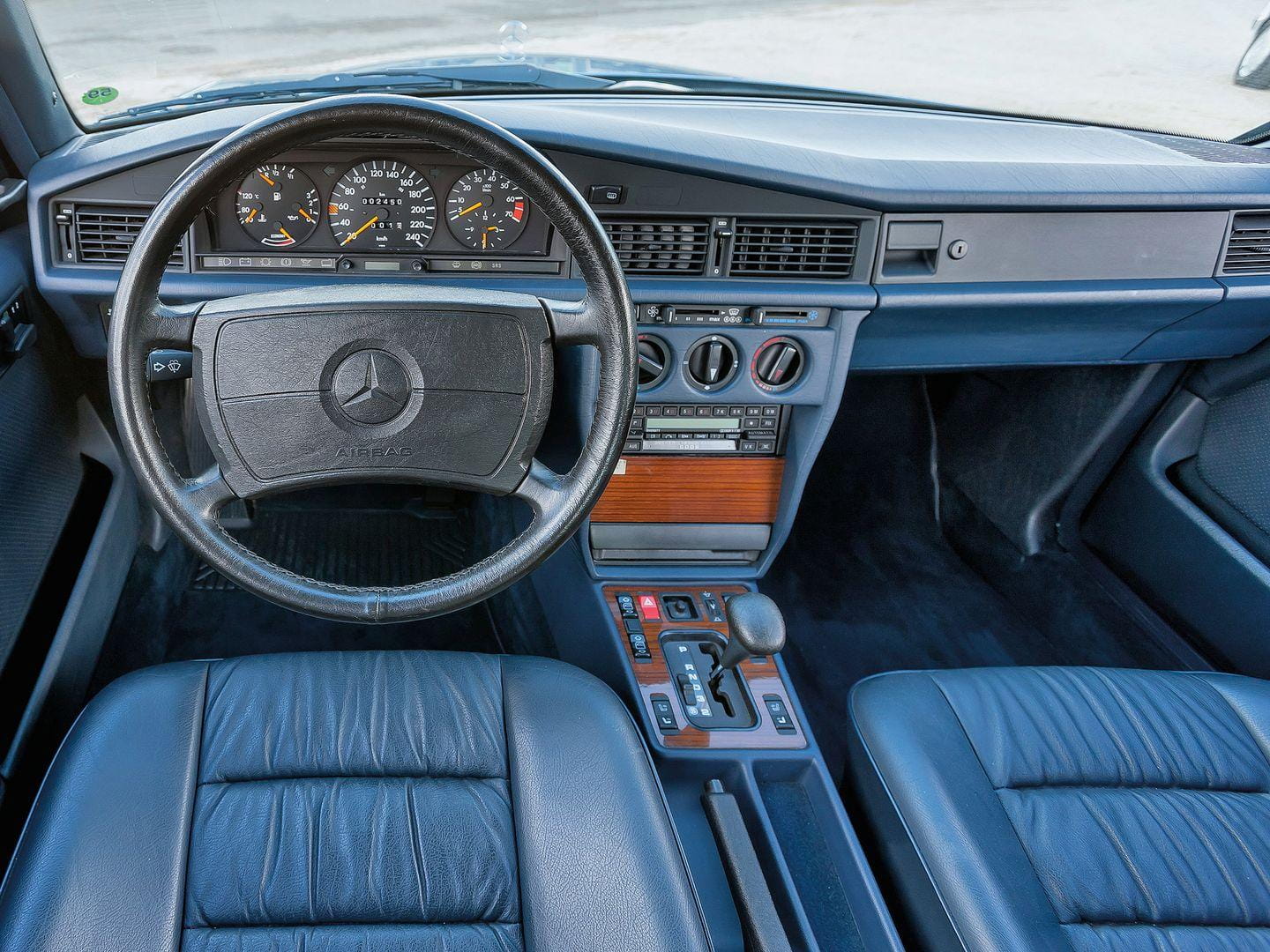 Era un coche realmente bonito y proporcionado. Los W201 son youngtimers preciosos, y la combinación de llantas y colores escogida para este descapotable era especialmente agraciada. Llantas de 15 pulgadas de aleación – procedente de la línea Sport de los W201 – y una carrocería en color azul claro, se unían con un habitáculo de cuatro plazas reales, forrado en cuero de color azul. De longitud prácticamente idéntica a un 190 E de cuatro puertas, poseía una elegante capota de lona para cerrar el habitáculo.
