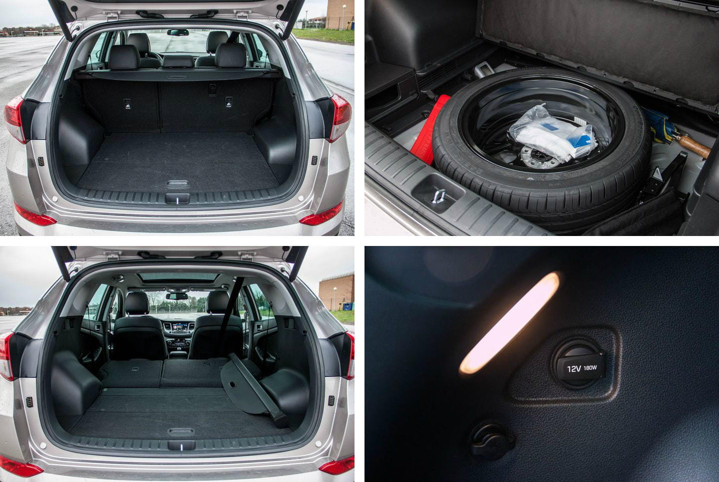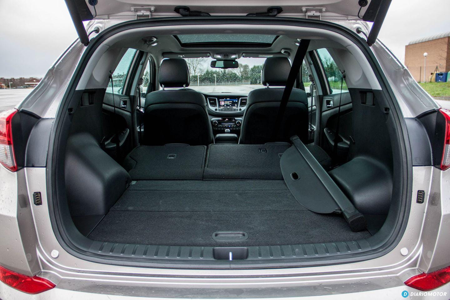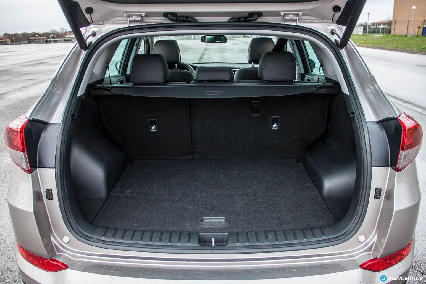 El maletero del Hyundai Tucson tiene 490 litros de capacidad, con formas muy regulares. El Kia Sportage tiene un maletero de 500 litros, y el Nissan Qashqai cubica 430 litros. El rey del espacio es el Volkswagen Tiguan, con 615 litros de maletero. Abatiendo los asientos se forma una superficie completamente plana, que permite cargar hasta 1.500 litros de volumen. Dispone de una toma de corriente en el maletero, así como una rueda de repuesto a tamaño completo. No hay diferencia de tamaño de maletero con respecto a los Tucson 4×2.