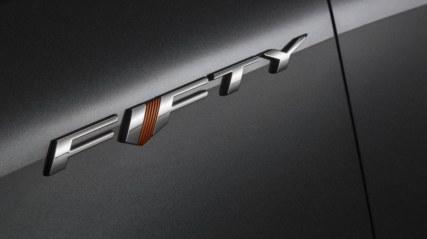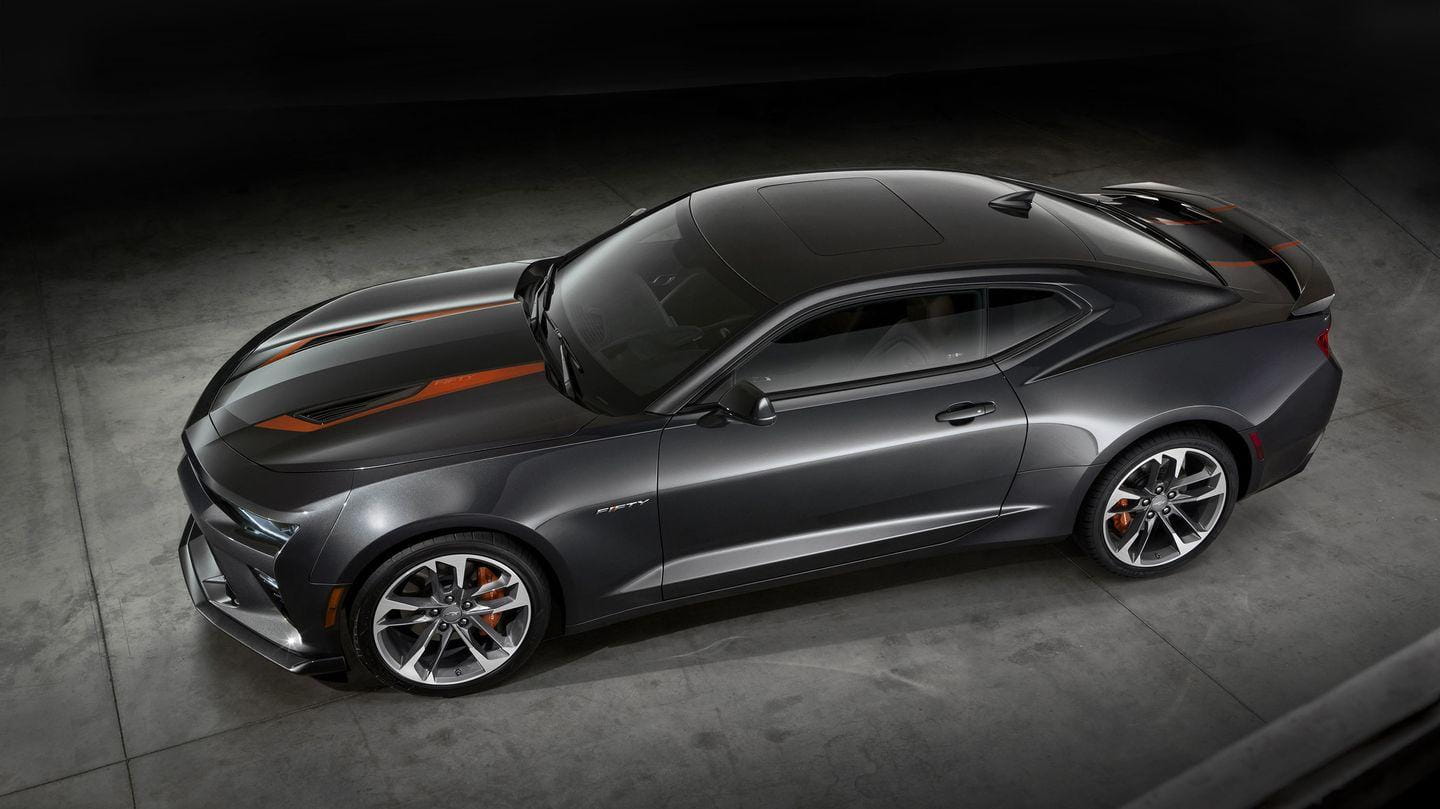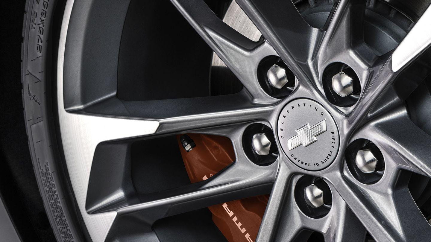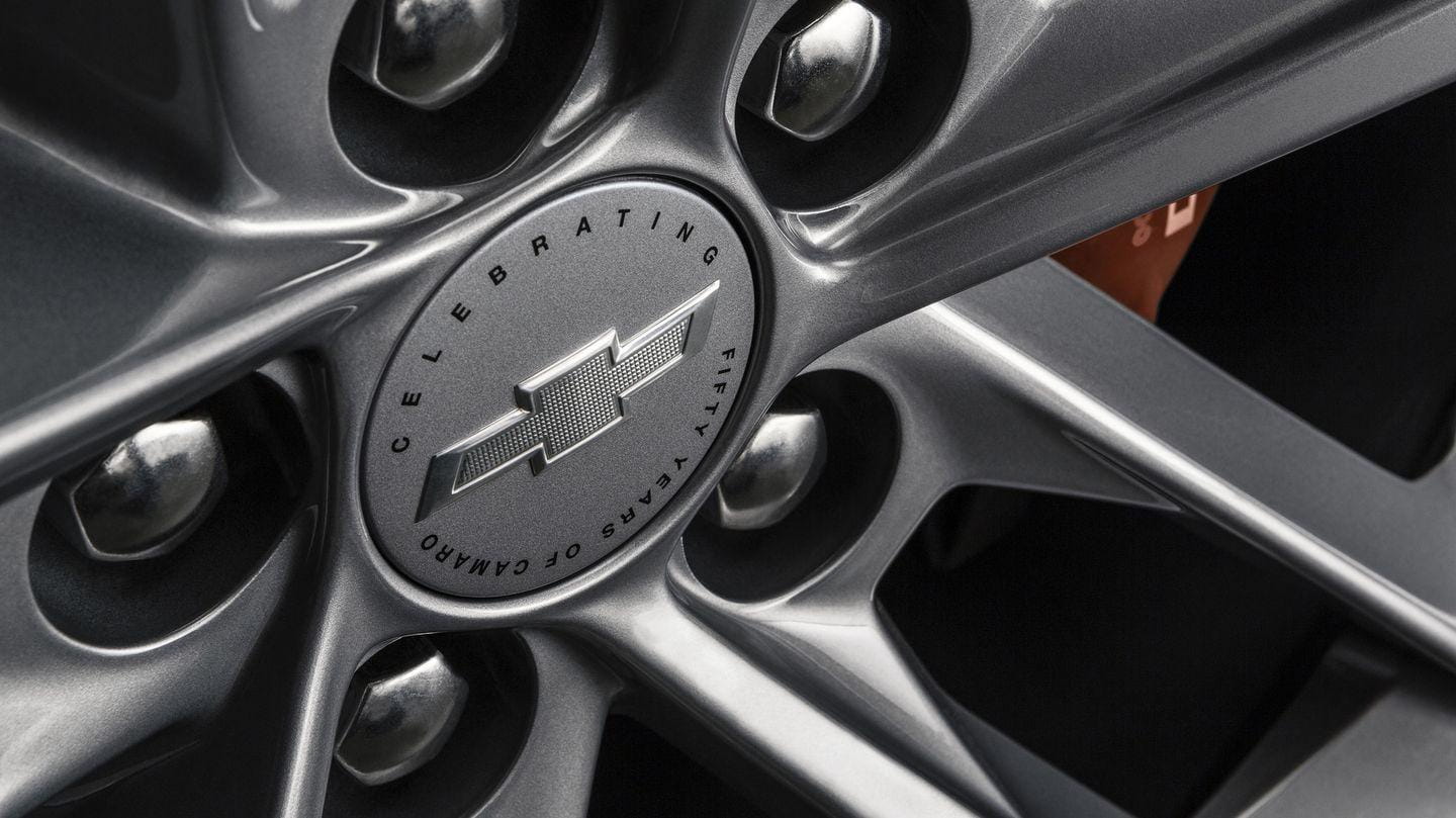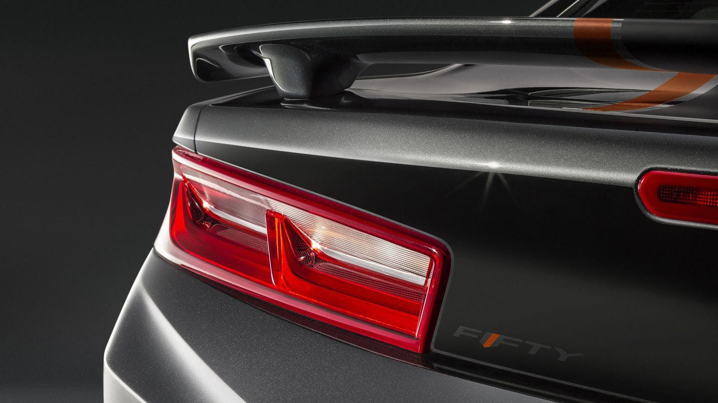 Para empezar, sus llantas de 20 pulgadas son únicas para esta versión, y a su color plateado se añaden detalles en color naranja para sus pinzas de freno. Otros detalles únicos de esta versión son un emblema donde se puede leer «Fifty» en sus aletas delanteras y una pegatina en el portón del maletero con el mismo emblema y un pequeño detalle en color naranja. Este mismo color también está presente en las franjas longitudinales del capó y en el portón del maletero del coche, distanciándolo de otros Camaro.