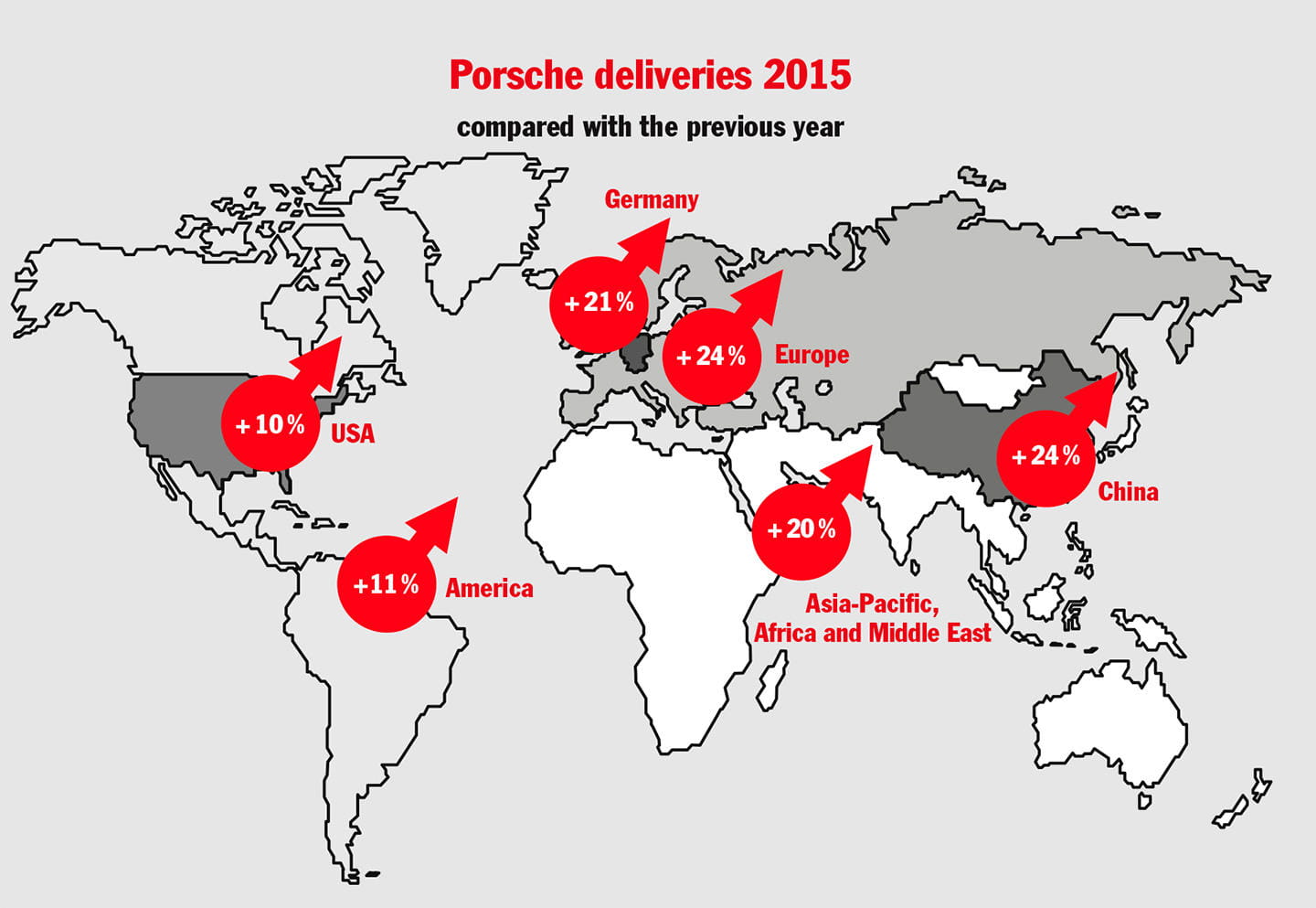 Europa ya ha dejado de ser el mercado más importante para Porsche. De hecho, el mercado en que más unidades se venden es el del eje Asia-Pacífico. China es el mercado individual más potente, y cerró 2015 con un total de 58.009 unidades. Estados Unidos sigue siendo sumamente importante, y en una segunda posición llegó a las 51.756 unidades. En casa, en Alemania, sus cifras siguen siendo espectaculares para el tamaño del mercado, y cerraron 2015 con 28.953 unidades.
