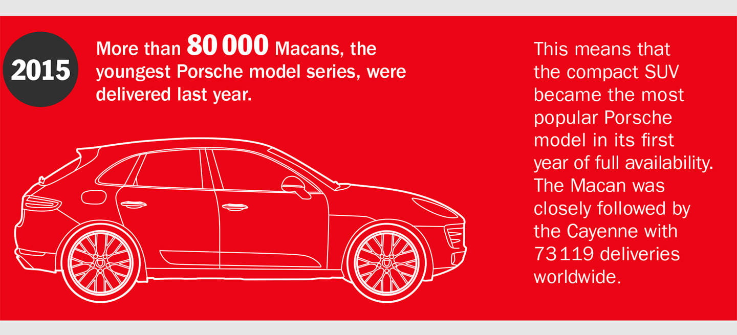Porsche ha aumentado sus ventas en todos los mercados en los que está presente. Cabe destacar el crecimiento de un 24% en dos mercados en los que el Porsche Macan ha irrumpido con mucha fuerza, China y Europa. En Alemania ha crecido un 21%. Y en España el crecimiento aún ha sido más abultado, de un 28,5% con respecto a 2014. En 2015 se vendieron en España 867 unidades de Porsche Macan, una cifra espectacular y superior a la de coches como el Volkswagen Touareg, el Volvo XC90, el Mitsubishi Montero, el Mercedes ML (en realidad con 868 unidades empataría técnicamente), o el Lexus RX, que aunque no sean rivales directos sí son modelos importantes en sus respectivas categorías.