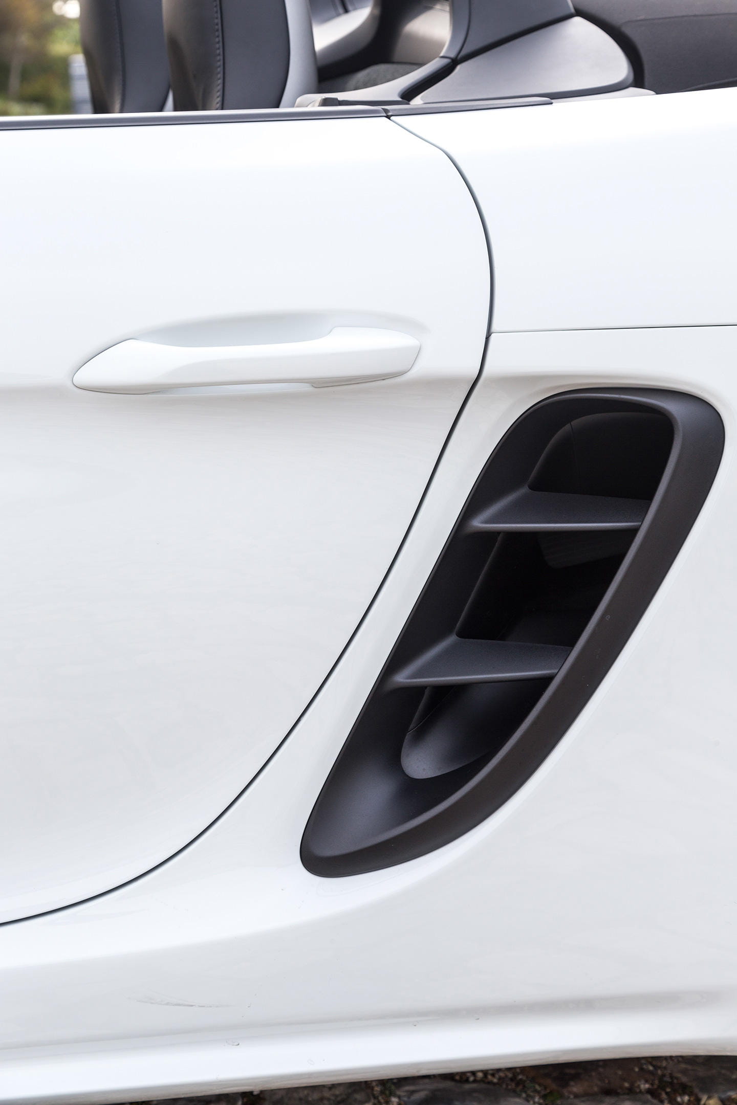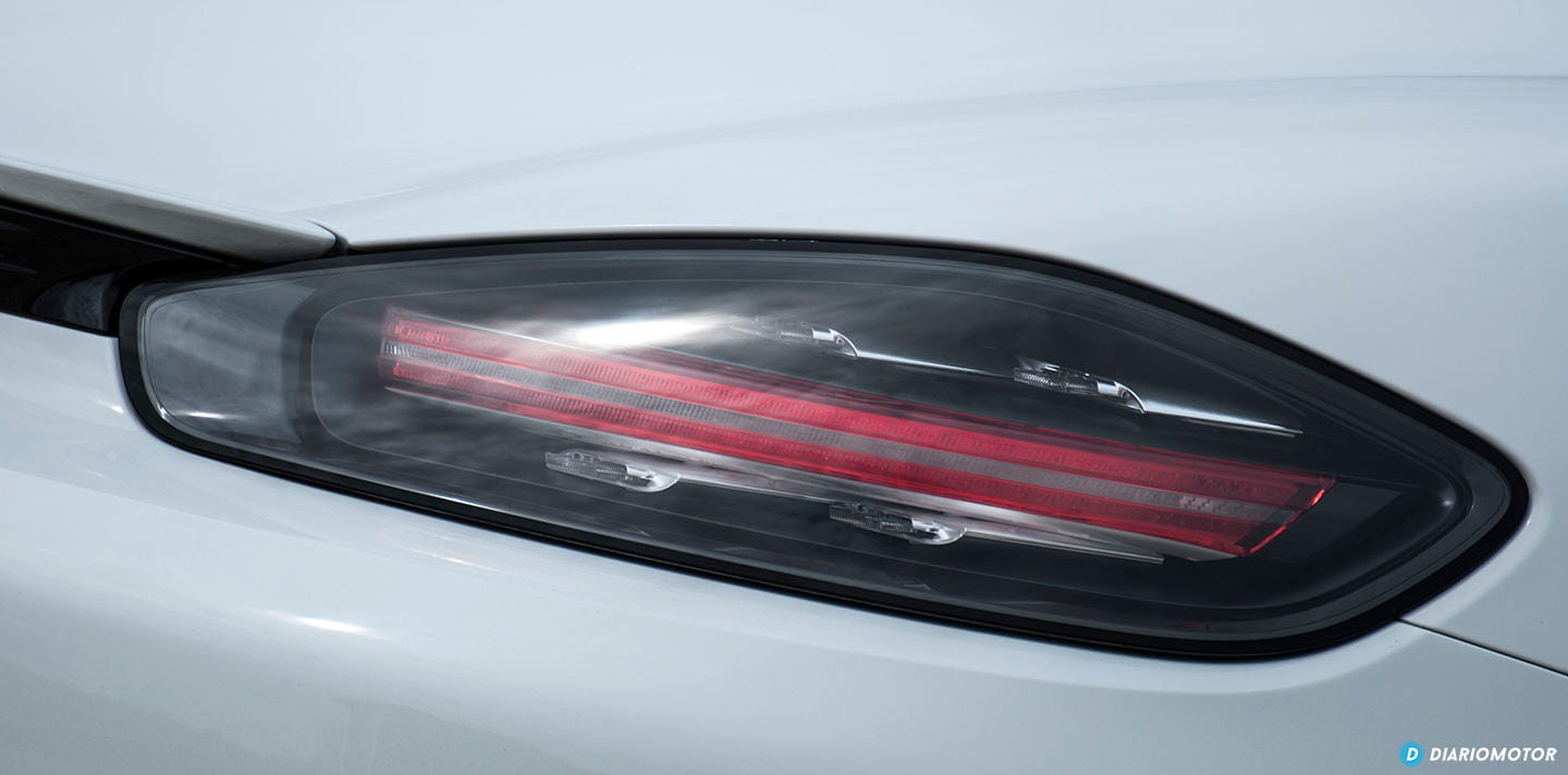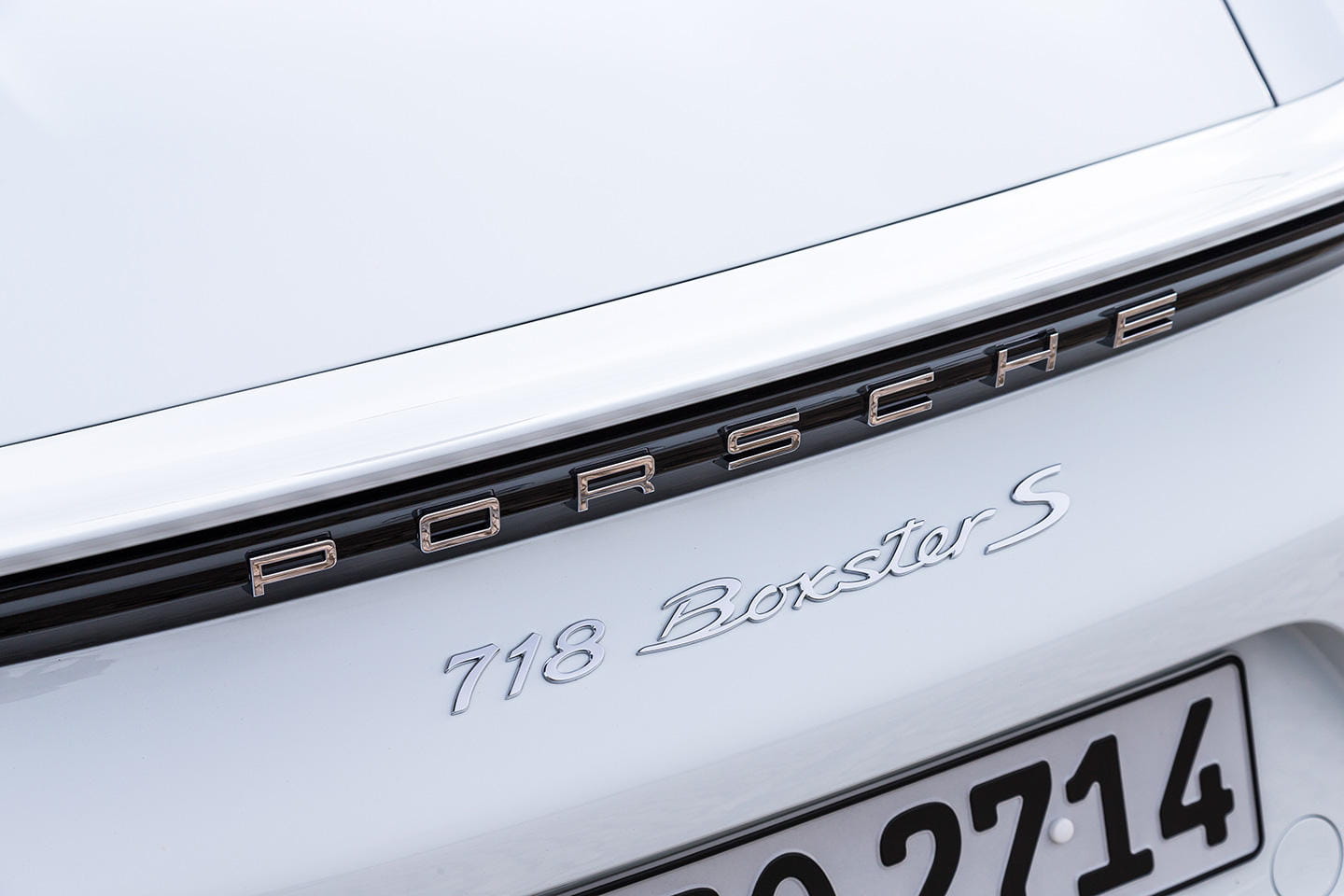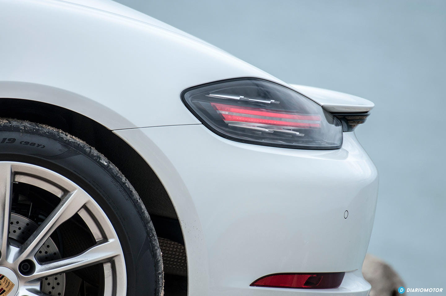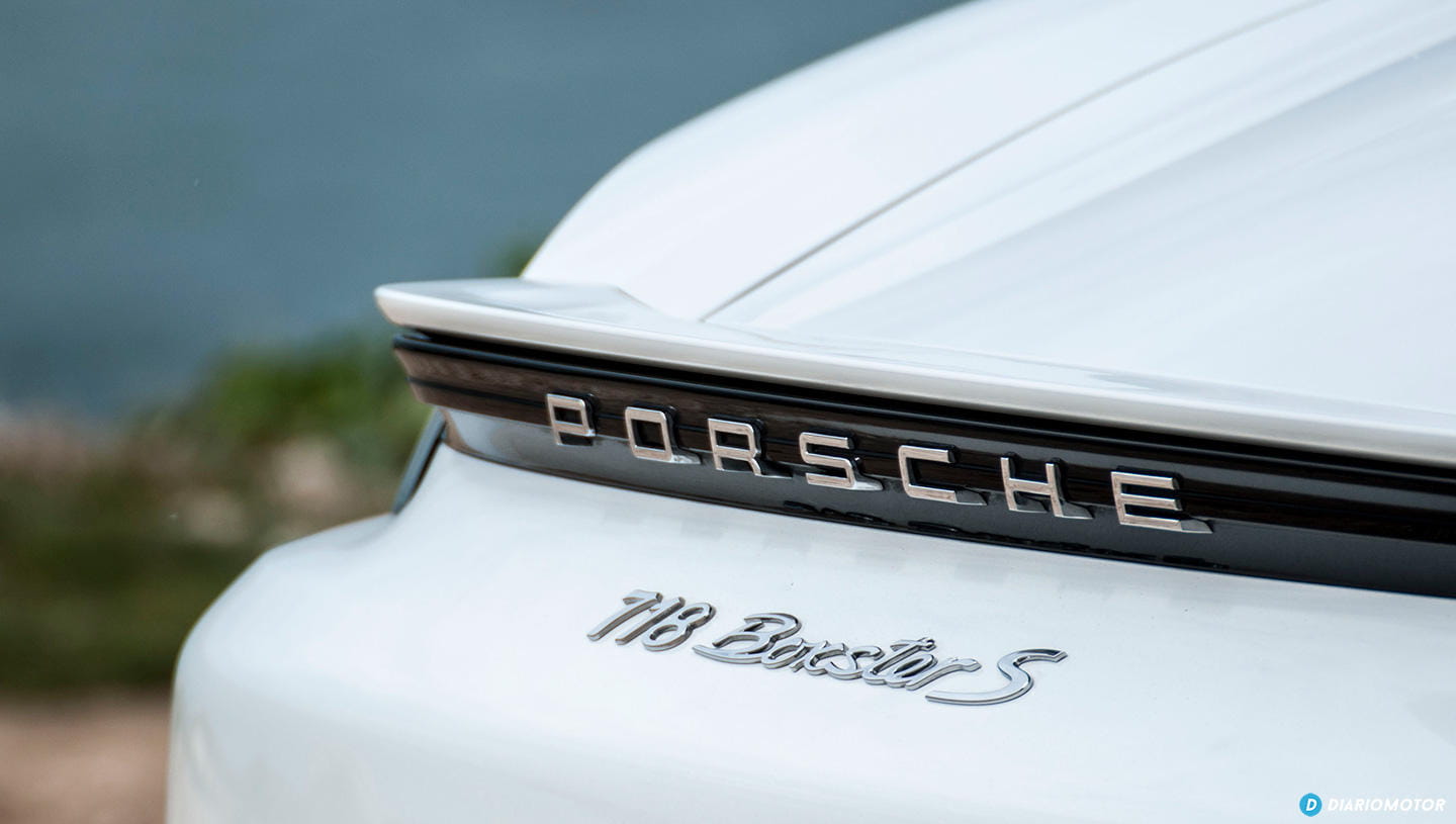 Contemplo con atención lo que tengo en frente. Aunque su silueta siga siendo la misma, este Porsche 718 Boxster es completamente nuevo, y también cualquier panel exterior en el que nos fijemos, excepto las tapas de las capós delantero y trasero. Los detalles en los que más se aprecian los cambios los encontramos en el diseño de los faros, los pilotos traseros, y sobre todo la integración del spoiler trasero en la zaga. Uno de los detalles más característicos del nuevo Porsche 718 Boxster es precisamente la franja negra que une los pilotos posteriores y sobre la cual se inscribe el emblema Porsche.