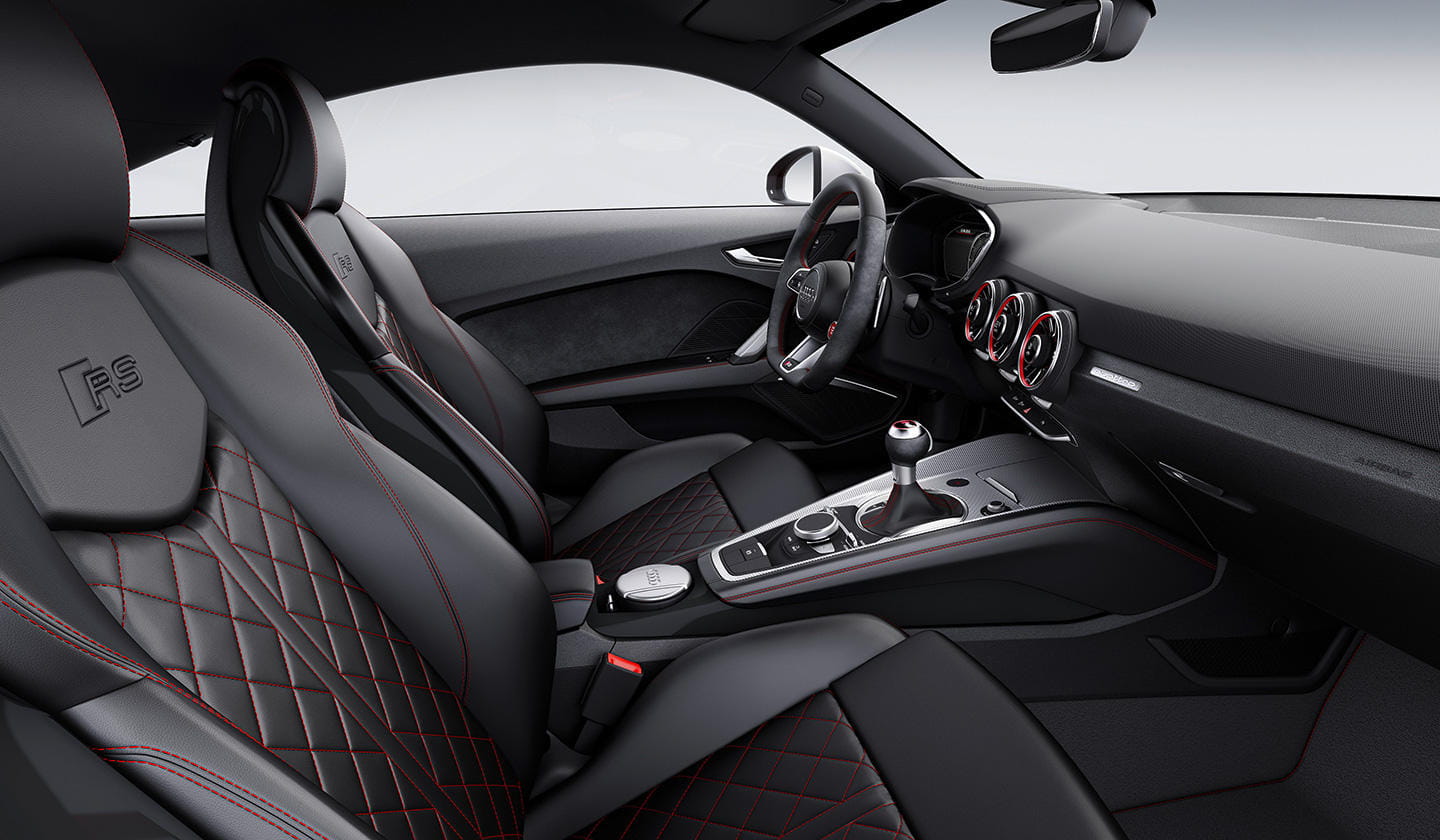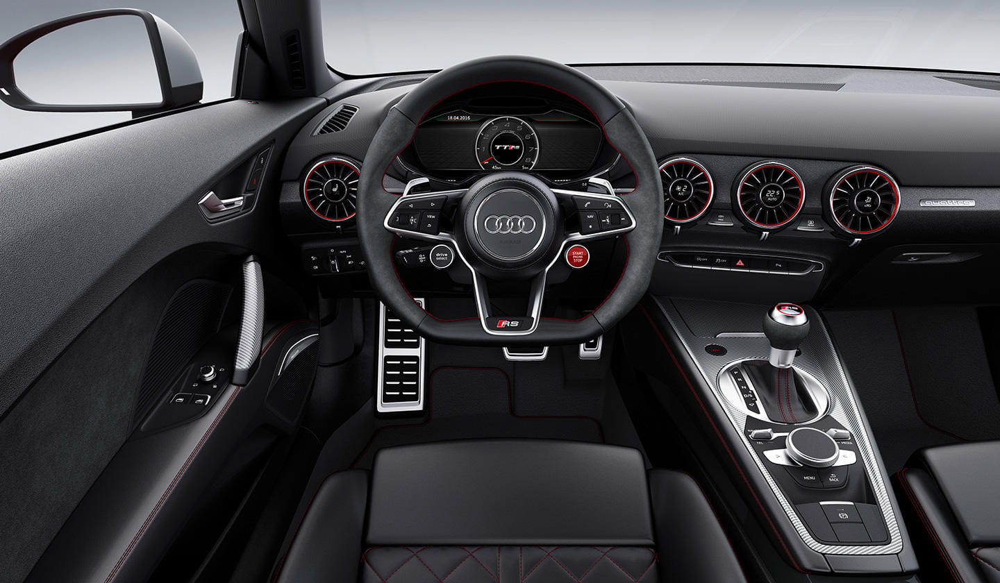 En este Audi TT RS no solo nos encontramos con unos asientos deportivos de piel, con revestimientos de piel y Alcantara con las costuras rojas visibles, e inserciones de aluminio por doquier, sino también con el volante de su hermano mayor, el volante del Audi R8. Un volante que integra, entre otras cosas, un botón de arranque, inspirado en la competición, y el selector de modos de conducción drive select, a modo de manettino en un satélite solidario al volante.