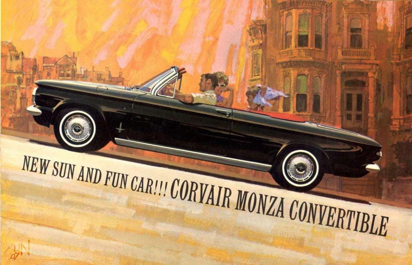 Ese coche era el Chevrolet Corvair. Un coche peculiar, que fue víctima del «Unsafe at Any Speed» de Ralph Nader, criticando su escasa protección a los ocupantes y dinámica complicada, causante de multitud de accidentes. Era un coche de motor trasero, disponible únicamente con propulsores bóxer de seis cilindros refrigerados por aire. Algunas revistas lo bautizaron como «el Porsche de los pobres», por su configuración similar a los Porsche 356, entonces coetáneos – el Porsche 911 no sería lanzado hasta 1963, años después.