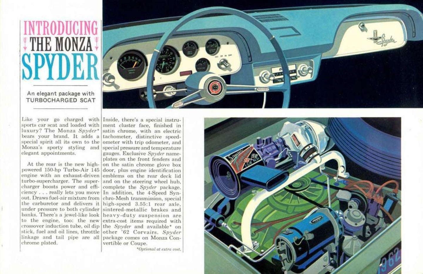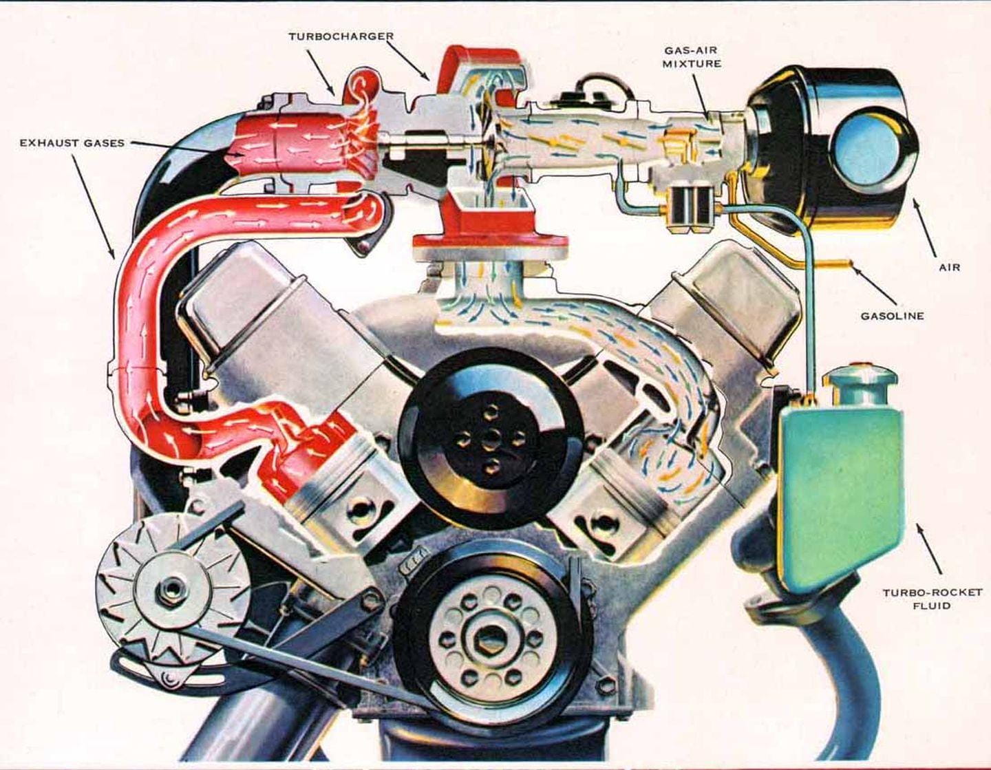 Fue a mediados de 1962 cuando Chevrolet lanzó el Corvair Monza Spyder con un revolucionario motor turbo refrigerado por aire. Era un motor bóxer de seis cilindros y 2,4 litros, que gracias al turbocompresor pasaba de los modestos 80 CV de su versión atmosférica a unos respetables 150 CV, entonces una potencia más que correcta. El turbocompresor doblaba la potencia del motor, y aumentaba el par máximo desde los flojos 174 Nm del motor atmosférico a unos respetables 285 Nm, disponibles entre las 3.200 rpm y las 3.400 rpm.