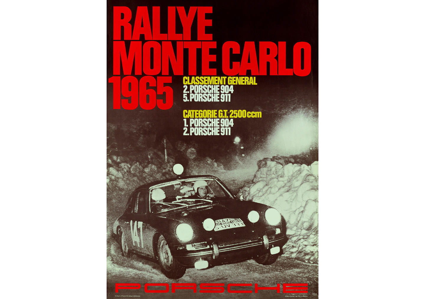 En este cartel del Rallye de Monte-Carlo de 1965 ya nos podemos percatar de la presencia en carrera del Porsche 911, compartiendo pista con el flamante Porsche 904 de motor central.